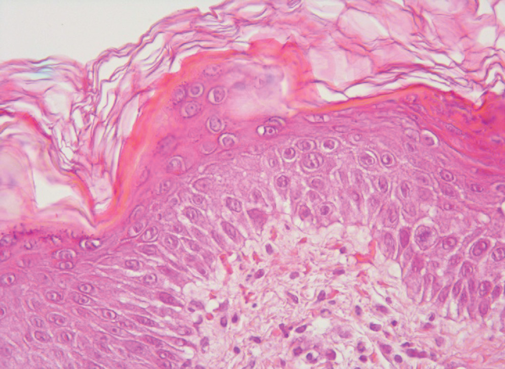 На 2-й неделе стационарного лечения отмечено появление множественных петехиальных высыпаний на коже туловища, верхних и нижних конечностей, локализованных эритем с формирующимися пузырями, покрышки пузырей при незначительном механическом воздействии сравнительно легко повреждаются, наблюдается отслоение верхних слоев эпидермиса (положительный симптом Никольского), крупнопластинчатое шелушение на коже лица, шеи, груди и паховой области, эрозии на слизистой в полости рта и красной каймы губ (рис. 1). В лабораторных анализах обращает на себя внимание выраженный лейкоцитоз (55,2 × 109/л) со сдвигом до метамиелоцитов (п/я нейтрофилы — 28%, метамиелоциты — 1%, миелоциты — 14%), гипокоагуляция (МНО: 2,86; тромбоциты: 43 × 109/л), прокальцитонин — 0,43 нг/мл. Выполнена биопсия кожи. При гистологическом исследовании в эпидермисе выявлены паракератоз, скопления клеточного детрита в роговом слое, акантоз, спонгиоз, вакуолизация цитоплазмы отдельных клеток базального слоя; в дерме — экстравазаты эритроцитов, отек, периваскулярные лимфогистиоцитарные инфильтраты (рис. 2, 3).