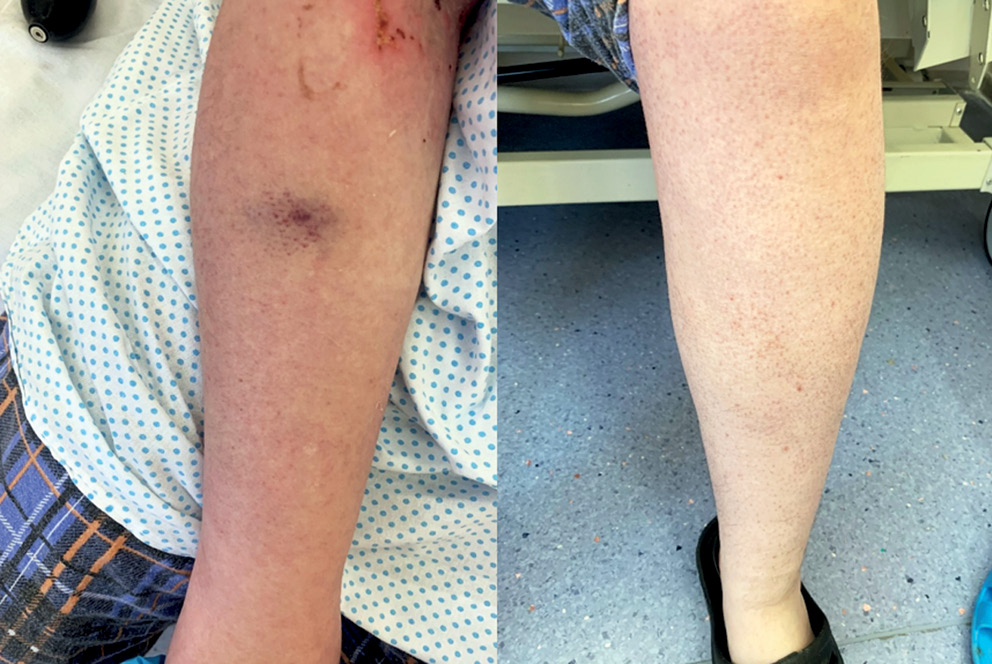 Проводимое лечение: отмена препарата вальпроевой кислоты, применение глюкокортикоидов (дексаметазон 24 мг 7 дней внутривенно) и инфузионная терапия. На 2-е сутки терапии глюкокортикоидами сохранялась негативная динамика в виде появления новых элементов, что было расценено как недостаточность эффекта глюкокортикоидов, принято решение о применении циклоспорина А 150 мг 2 раза/сут 10 дней внутривенно. На фоне проводимой терапии отмечается улучшение состояния кожного покрова: отсутствие новых элементов, эпителизация эрозий (рис. 4), снижение уровня лейкоцитов (10 × 109/л), нормализация уровня тромбоцитов (190 × 109/л) и МНО.