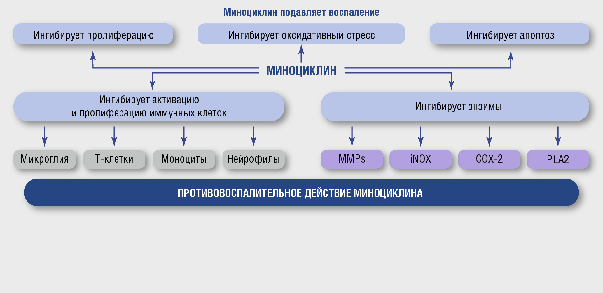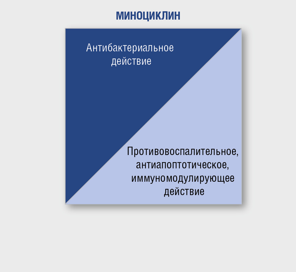 Рис. 1. Многогранное действие миноциклина: антибактериальное, противовоспалительное, антиапоптотическое, иммуномодулирующее