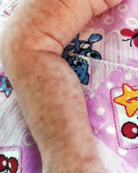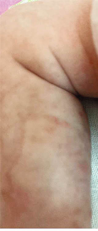 Материал и методы. Родители больной М. в возрасте 1 месяца обратились к дерматологу БУ «РКВД» с жалобами на высыпания на верхних и нижних конечностях у ребенка, которые беспокоят со 2-х суток жизни. Из анамнеза известно, что ребенок от 2-й беременности, 1-я беременность закончилась родами, ребенок женского пола, со слов родителей высыпания подобного характера не беспокоили. Беременность протекала без особенностей. Роды срочные, естественным путем. Масса ребенка при рождении 3254 г, рост — 53 см, состояние расценивалось как удовлетворительное. На 2-е сутки жизни кожа приобрела ярко-розовый цвет, на верхних и нижних конечностях появились сгруппированные везикулы диаметром от 0,5 до 1 см с серозным содержимым, расположенные преимущественно по линиям Блашко (рис. 1). Ребенок переведен в отделение патологии новорожденных с диагнозом: внутриутробная инфекция, генерализованная форма, герпетической этиологии. Получала антибактериальные, противовирусные, антигистаминные препараты. Мама отмечала отсутствие эффекта проводимой терапии. Ребенок через 3 недели был переведен на амбулаторное лечение с подозрением на перенесенный синдром Лайелла. Родители ребенка отказались от проведения биопсии кожи и взятия материала для морфологического исследования.
