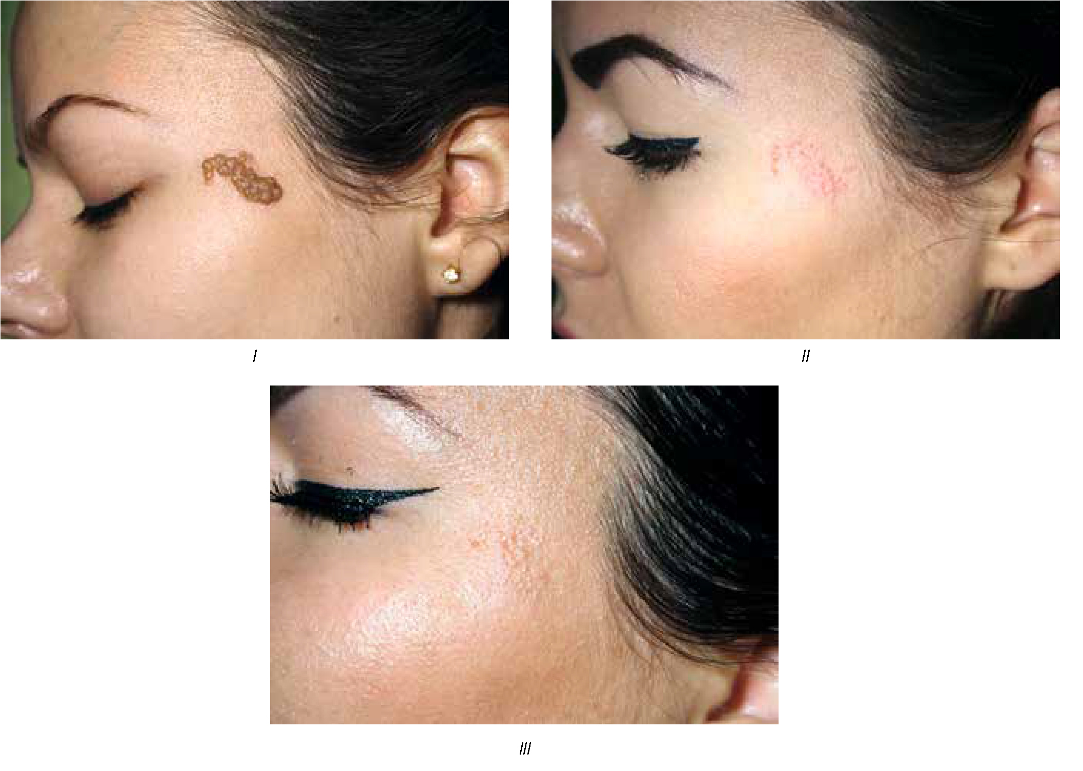 Immediately after laser treatment, the color of the nevus acquired a grayish tint for several days. After 7-10 days, the crusts exfoliated with restoration of the epidermis without hyper- or hypopigmentation. The treatment was carried out without anesthesia. After laser exposure, the skin was treated with a 0.05% chlorhexidine gluconate solution. In the early postoperative period, Bepanten cream was applied twice a day. The healing process after the laser procedure