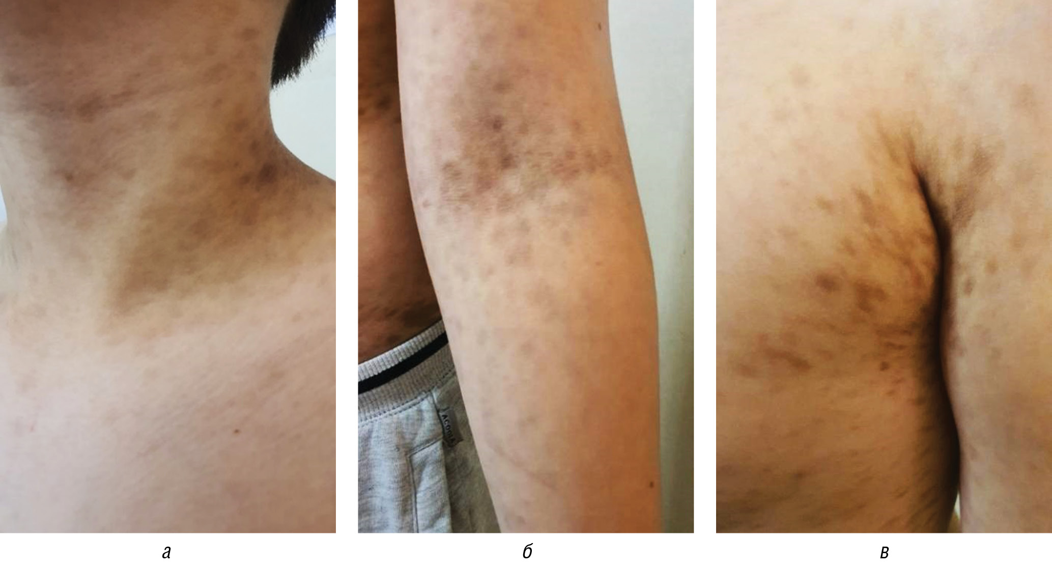 Рис. 1. Множественные светло-коричневые пятна на коже боковой поверхности шеи (а), локтевого сгиба (б) и аксиллярной области (в)