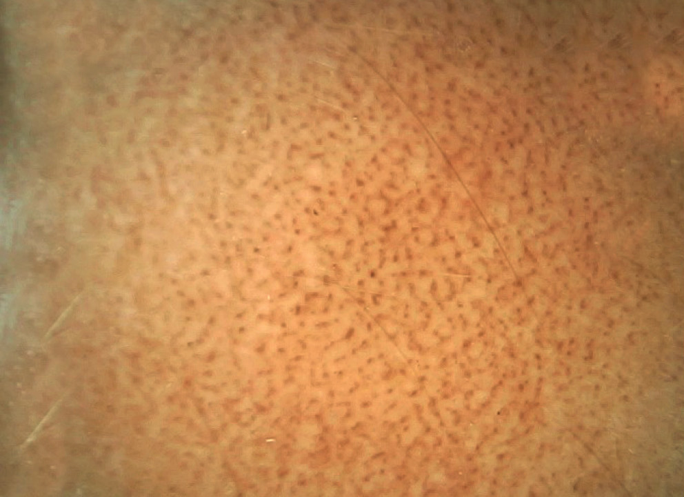 Fig. 2. Dermatoscopic picture of idiopathic eruptive macular pigmentation. Pseudoreticular pigmentary network (brown/grayish dots) in the area of the stain (video dermatoscopy)