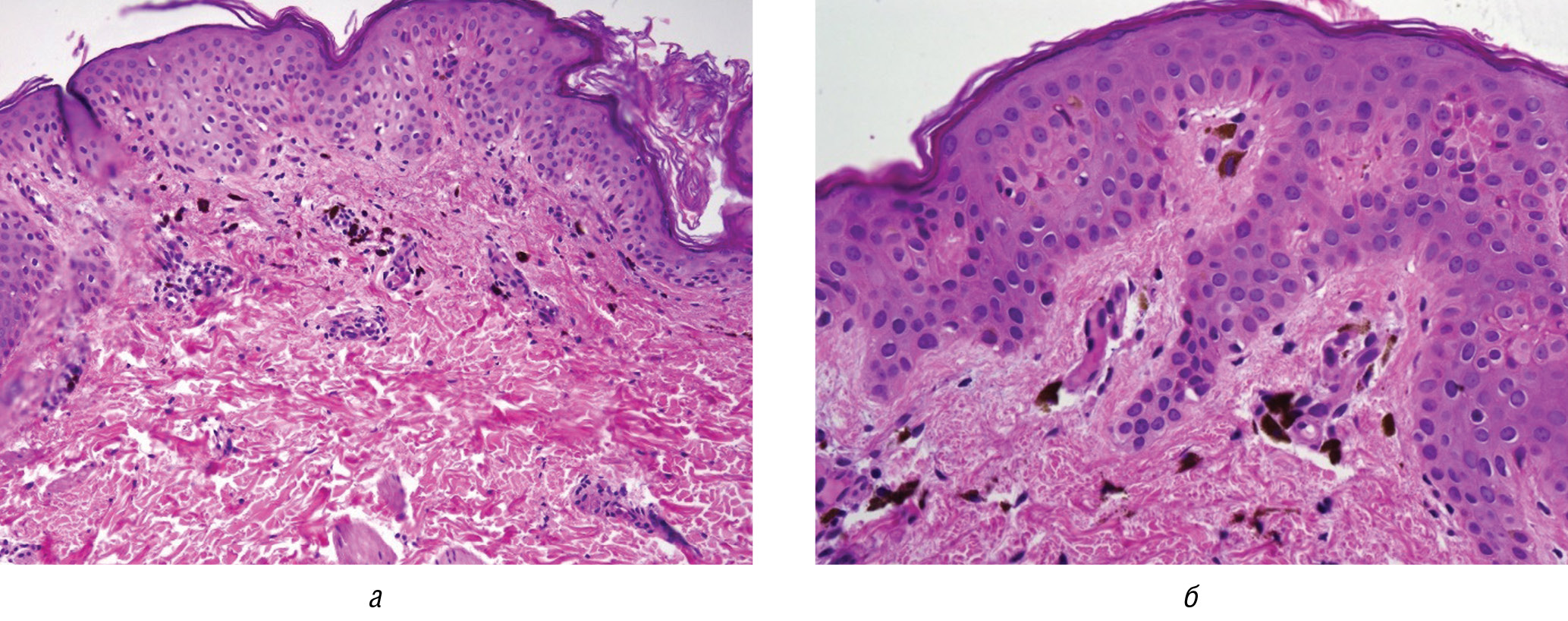 Рис. 3. Гистологическое исследование биоптата кожи, окраска гематоксилином и эозином: а — умеренно выраженная пигментация базального слоя эпидермиса, редкий периваскулярный лимфоцитарный инфильтрат и меланофаги в дерме (×100); б — умеренно выраженная пигментация базального слоя эпидермиса, меланофаги в дерме (×200)