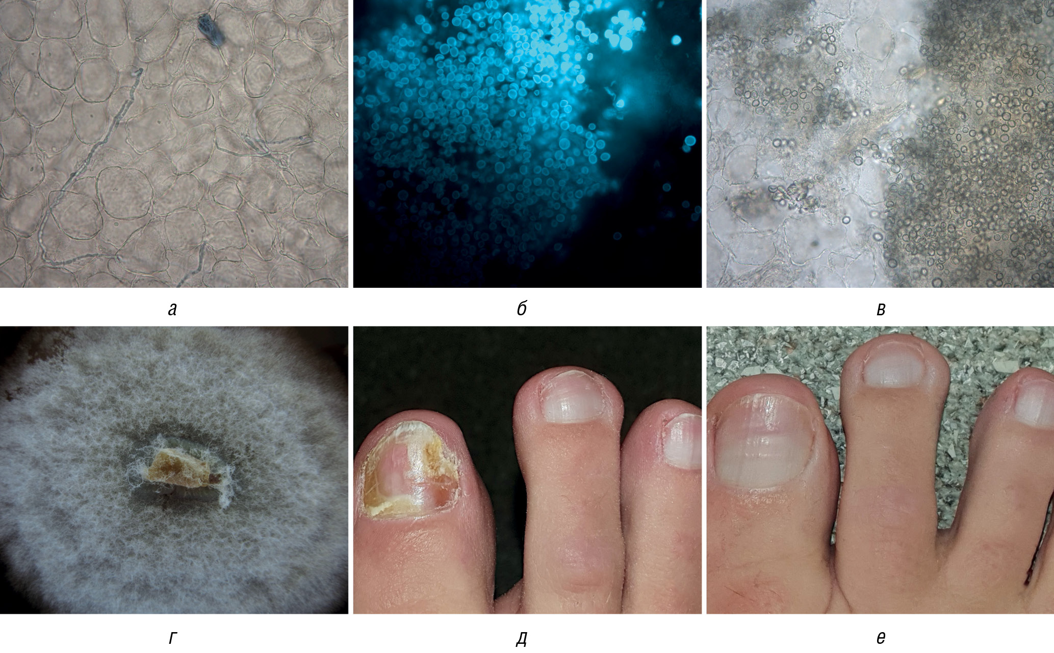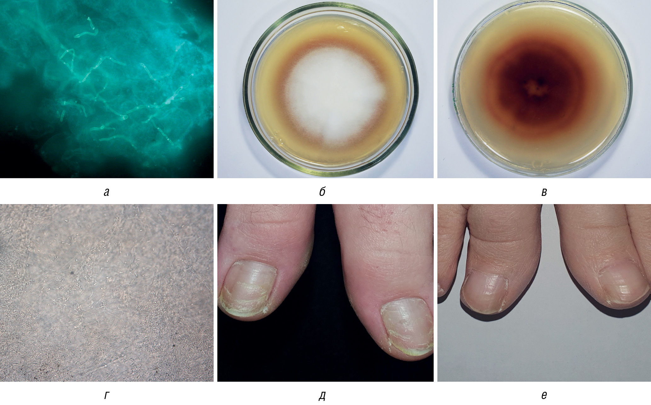 Fig. 1. Onychomycosis caused by T. rubrum: а — Morphological elements of T. rubrum — luminous mycelium in a scraping of the nail plates of the first toes under fluorescent microscopy, stained with calcofluor white, ×400; б — upper surface of a T. rubrum colony on potato agar: white, fluffy with a red rim; в — lower surface of the same colony, intense red; г — light microscopy of a culture of T. rubrum showing the characteristic pear-shaped microconidia; д — white superficial onychomycosis of the first toes caused by T. rubrum; е — healthy nail plates in woman 12 months after starting treatment for white superficial onychomycosis with 5% amorolfine lacquer twice a week for 6 months, then once a week for up to 1 year or more