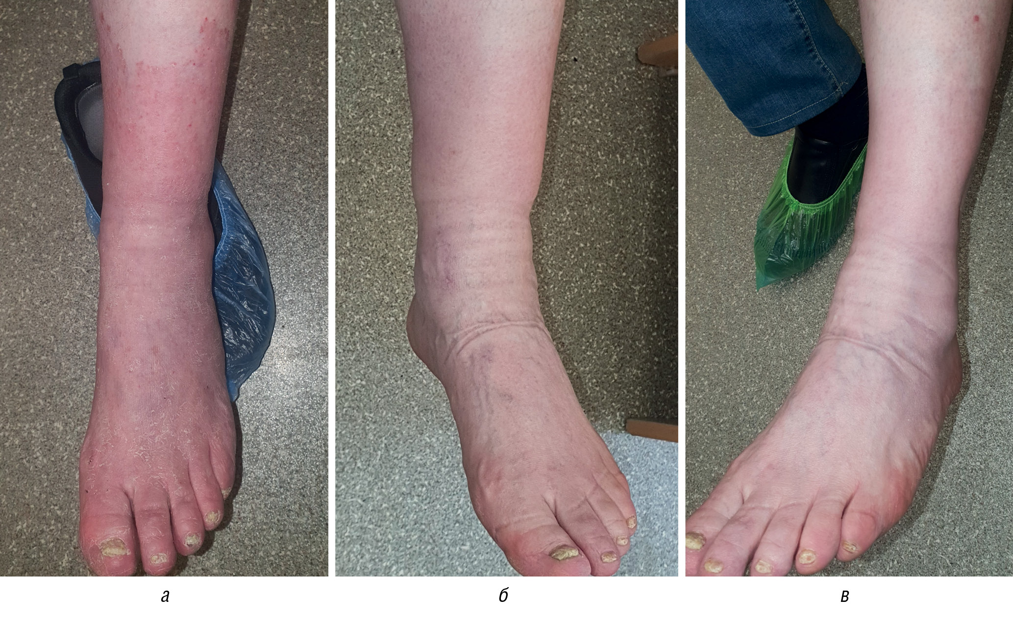 Рис. 3. Онихомикоз, вызванный T. interdigitale. а — микоз кожи правой стопы и нижней трети голени и тотальный онихомикоз, вызванные T. interdigitale, у больного 65 лет, развившиеся на фоне анкилозирующего спондилита и приема метотрексата — 15 мг в неделю в течение 10 лет; б — полное разрешение микоза кожи на фоне применения крема с сертаконазолом через 3 недели от начала лечения; в — отсутствие рецидивов микоза кожи на фоне профилактического применения лака Лоцерил® (5% аморолфин) 1 раз в неделю