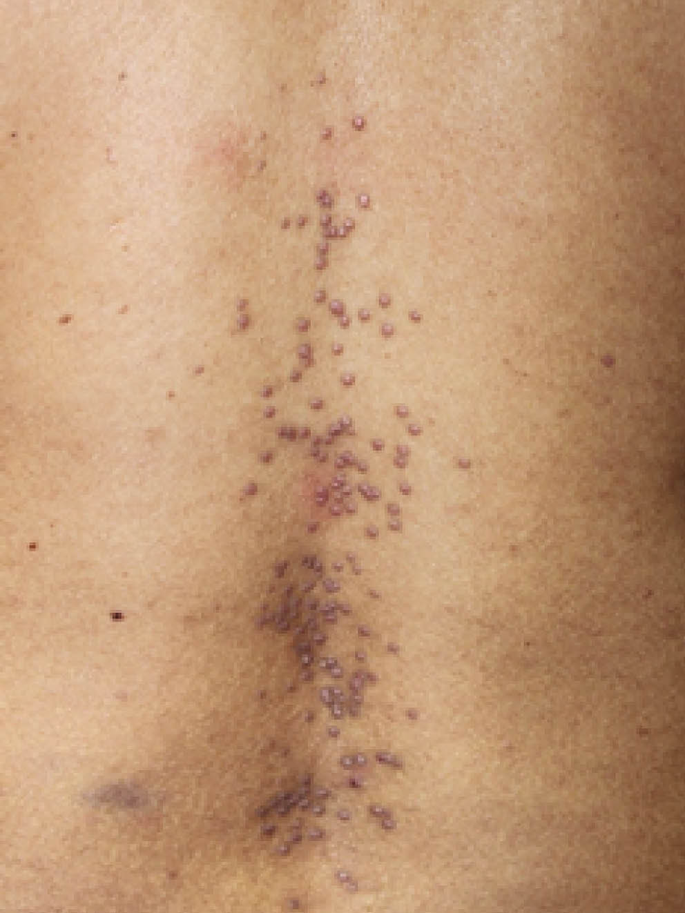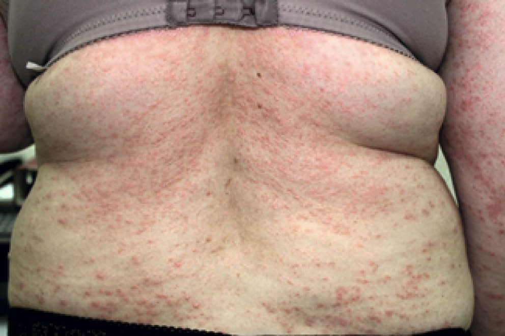 Рис. 2. Пациент Ф., 35 лет, распространенные высыпания в области спины, груди, боковых поверхностей туловища (5% поверхности тела), умеренный зуд (5 баллов по субъективной оценке), выраженность высыпаний (папулы — 3 балла, экскориации — 1 балл). Расчет индекса LPASI = 5/5 + 2 × 4 + 5 × 0 + 5 = 14 (баллов) — средняя степень тяжести