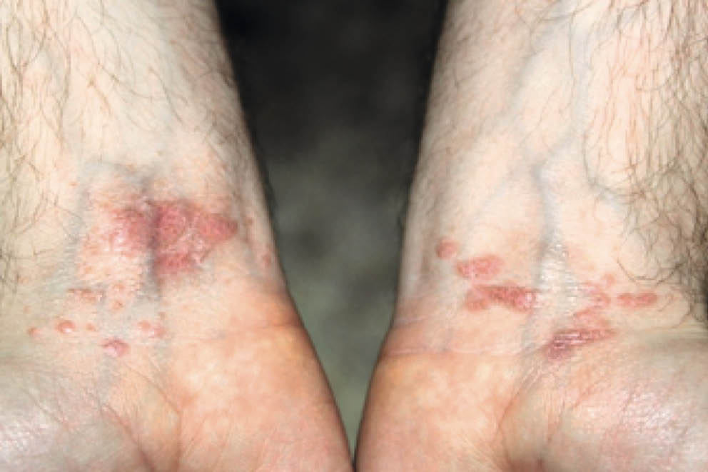 Рис. 3. Пациент П., 31 год, ограниченные высыпания в области запястий (0,2% поверхности тела), слабый зуд (3 балла по субъективной оценке пациентом), выраженность высыпаний (папулы — 2 балла). Расчет индекса LPASI = 0,2/5 + 2 × 2 + 5 × 0 + 3 = 7,04 — легкая степень тяжести