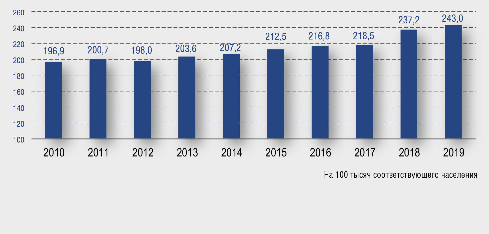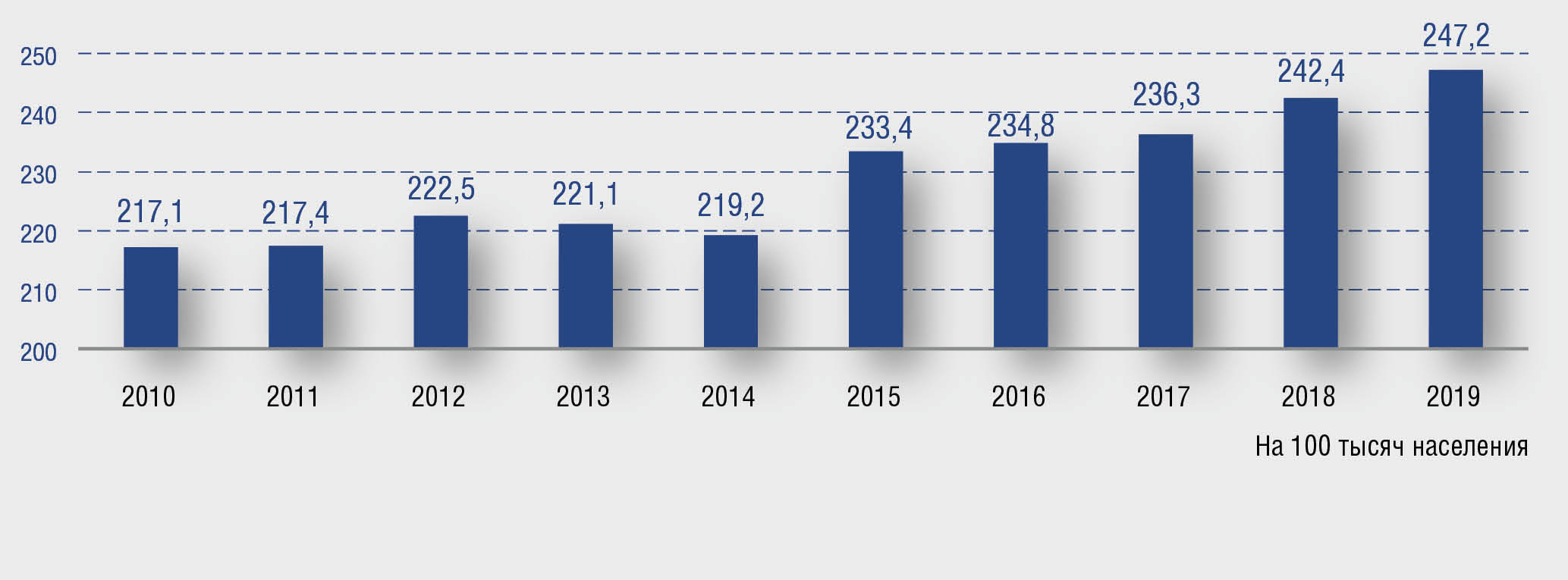Рис. 1. Распространенность псориаза среди всего населения Российской Федерации, 2010–2019 гг.