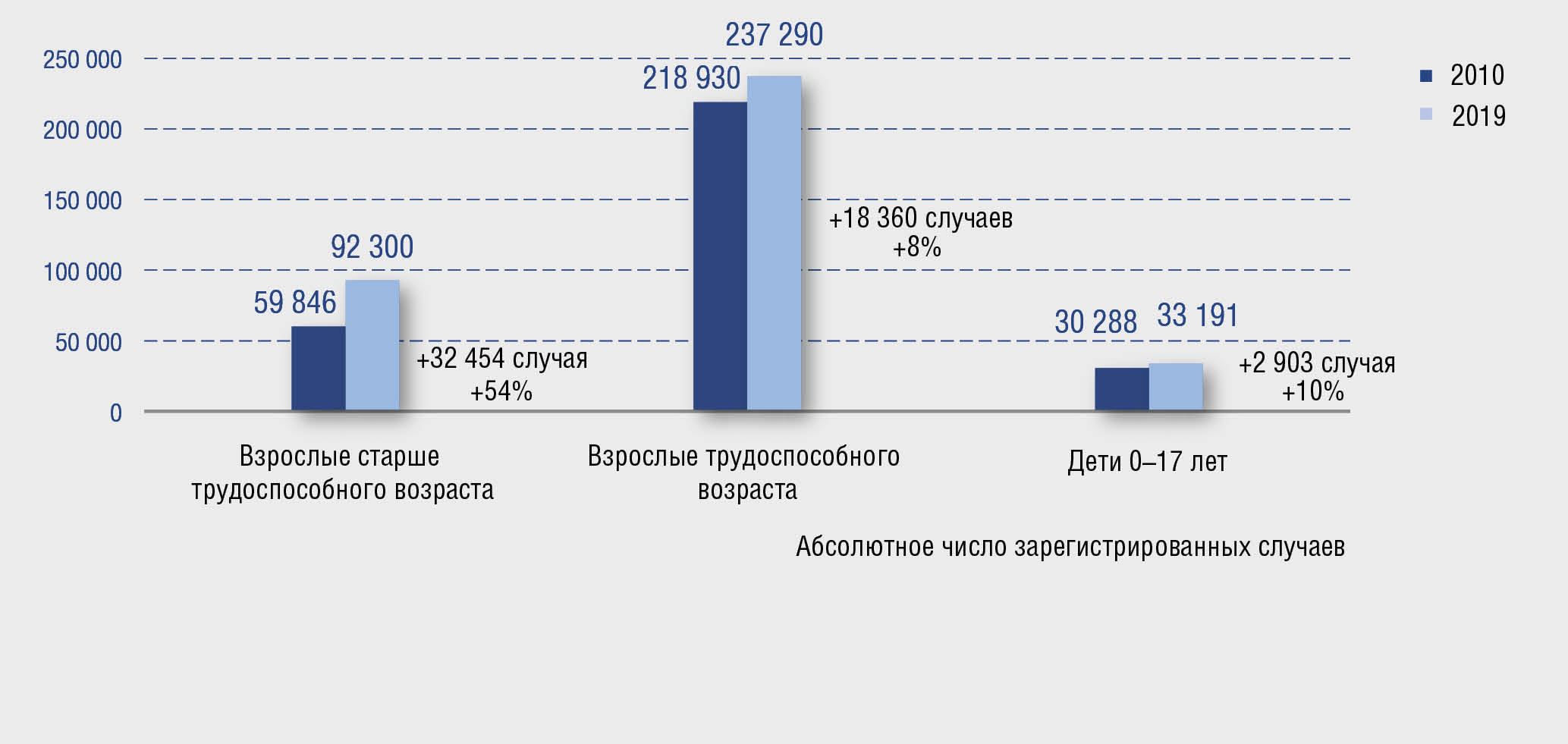 За рассматриваемый период можно отметить рост числа зарегистрированных случаев псориаза во всех возрастных группах населения. Однако наиболее существенный прирост числа случаев псориаза, на 54%, отмечается среди населения в возрасте старше трудоспособного — с 59 846 в 2010 г. до 92 300 — в 2019 г. За тот же период число случаев псориаза среди детей в возрасте 0–17 лет увеличилось на 10% (с 30 288 в 2010 г. до 33 191 — в 2019 г.), а среди взрослого населения трудоспособного возраста (женщины в возрасте 18–54 лет и мужчины в возрасте 18–59 лет) — на 8% (с 218 930 до 237 290) (рис. 2).