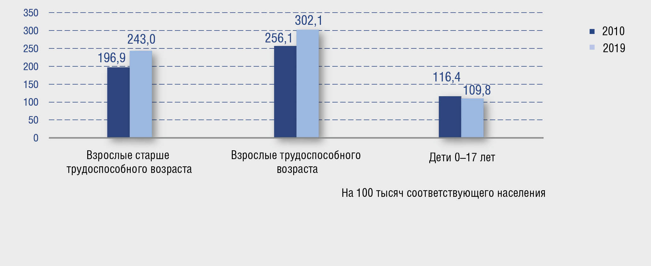 Среди взрослого населения зарегистрирован рост распространенности псориаза, составивший 18% среди взрослых трудоспособного возраста (256,1 в 2010 г., 302,1 — в 2019 г.) и 23% — среди взрослых в возрасте старше трудоспособного (196,9 в 2010 г., 243,0 — в 2019 г.). Распространенность псориаза среди детей 0–17 лет сократилась на 6%, с 116,4 до 109,8 на 100 тысяч соответствующего населения (рис. 4, 5).