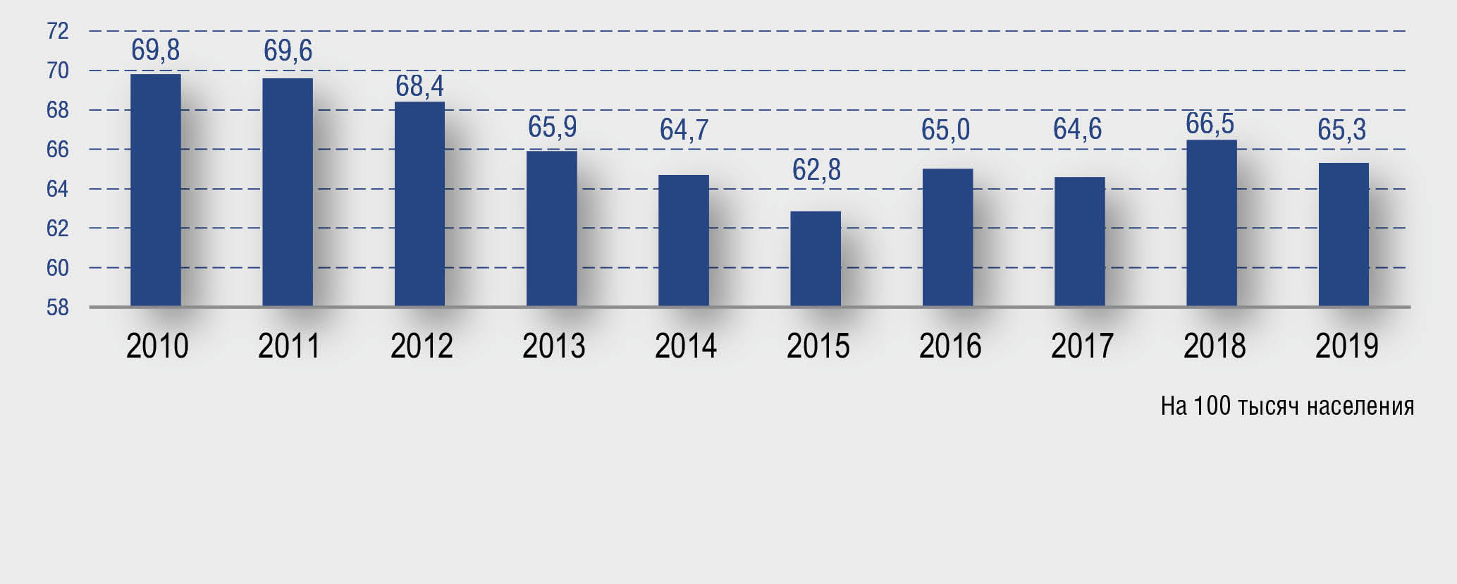 В 2019 г. всего было зарегистрировано 95 821 случай псориаза с впервые в жизни установленным диагнозом. Показатель заболеваемости составил 65,3 на 100 тысяч населения. За рассматриваемый период отмечается сокращение числа зарегистрированных случаев псориаза с впервые в жизни установленным диагнозом на 3,6% (99 348 случаев в 2010 г.) и снижение показателя заболеваемости на 6,4% (рис. 6).
