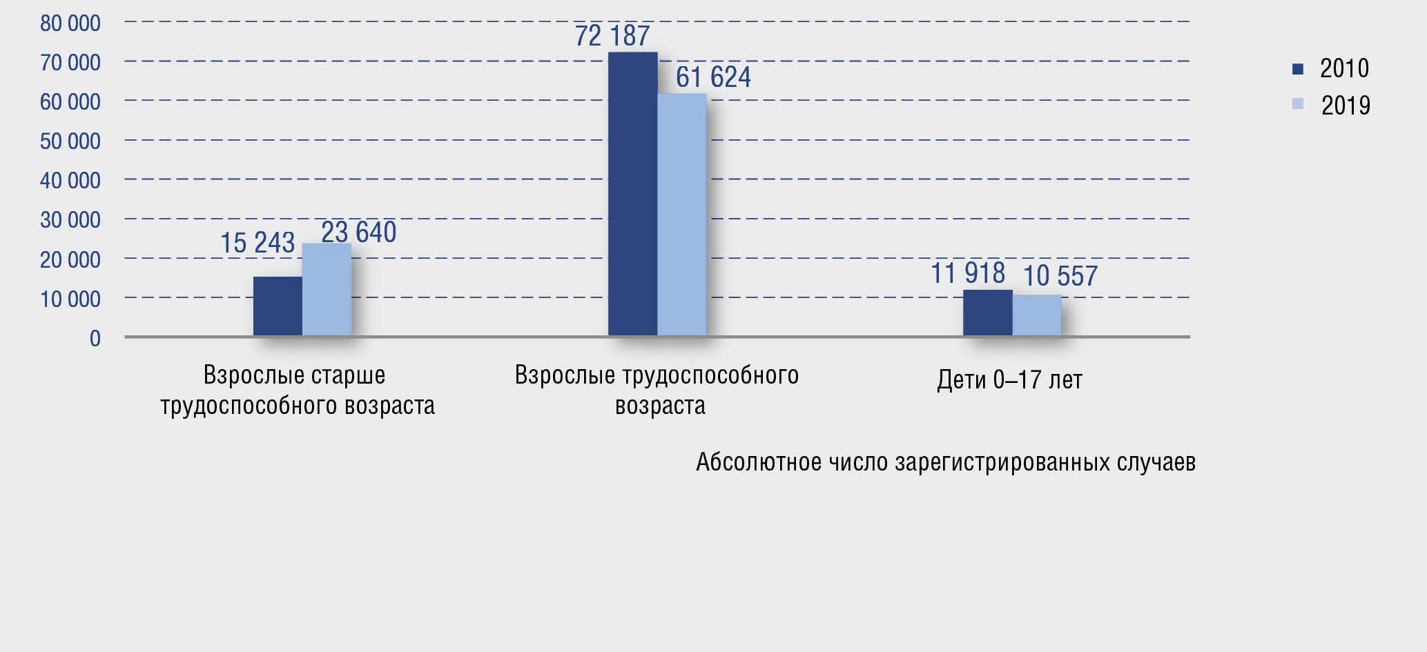 Вследствие более интенсивного прироста числа случаев псориаза, зарегистрированных среди лиц старше трудоспособного возраста, доля случаев заболеваний среди этой группы пациентов за период 2010–2019 гг. увеличилась с 19 до 26%. При этом доля случаев псориаза среди населения в возрасте 0–17 лет уменьшилась с 10 до 9%, доля среди взрослых трудоспособного возраста — с 71 до 65% (рис. 3).