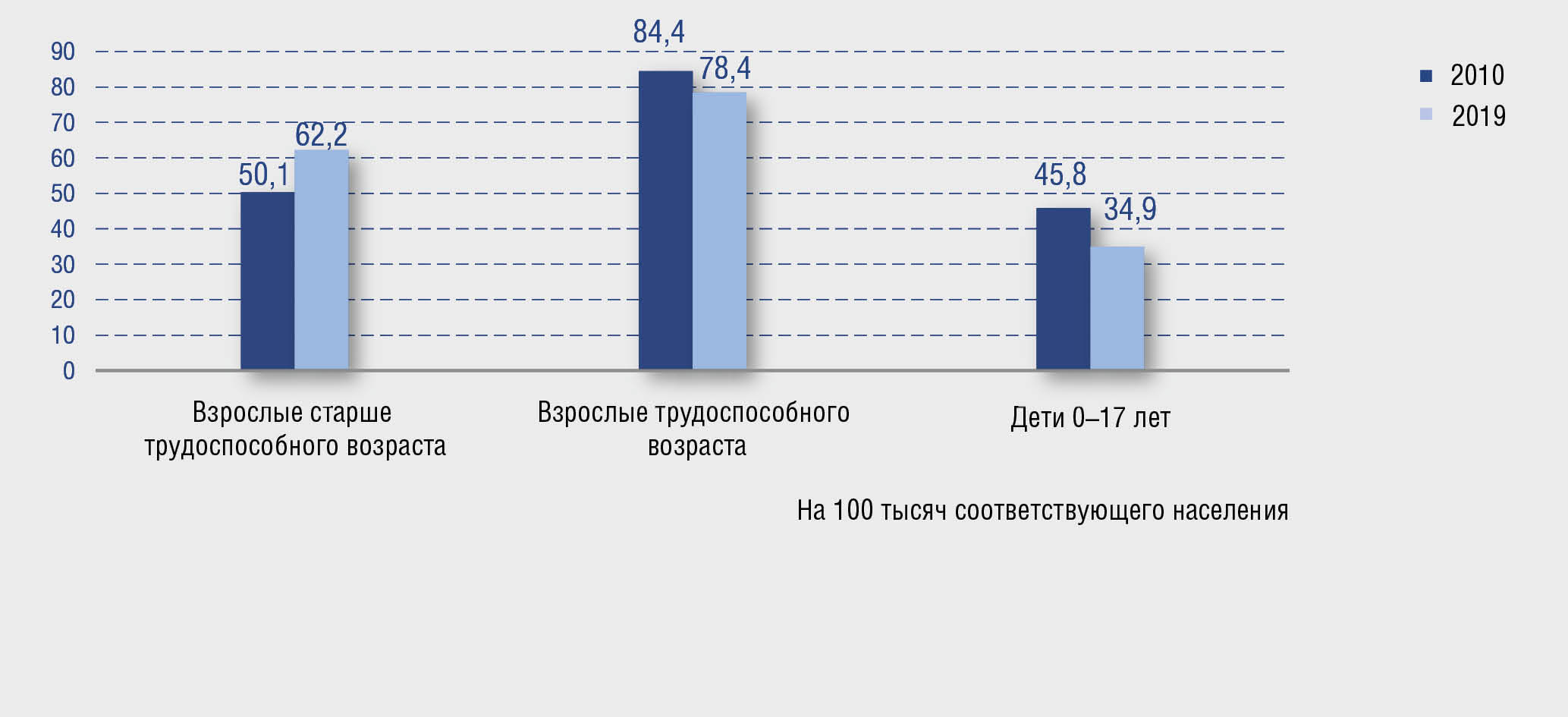 Среди детей в возрасте 0–17 лет зарегистрировано сокращение числа случаев псориаза с впервые в жизни установленным диагнозом на 11% и снижение показателя заболеваемости псориазом на 24% (45,8 в 2010 г., 34,9 — в 2019 г.). Среди взрослых трудоспособного возраста сокращение числа случаев псориаза с впервые в жизни установленным диагнозом составило 15%, показатель заболеваемости снизился на 7% (с 84,4 в 2010 г. до 78,4 в 2019 г.) (рис. 7, 8).
