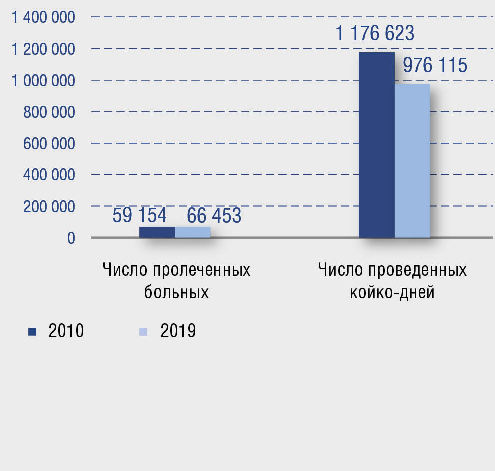 Стоит отметить, что рост числа пролеченных в круглосуточных стационарах пациентов с псориазом происходил, несмотря на проводимое в 2010–2019 гг. в Российской Федерации сокращение круглосуточного коечного фонда дерматовенерологического профиля: за указанный период он был уменьшен на 43%, с 15 713 до 8 878 коек.