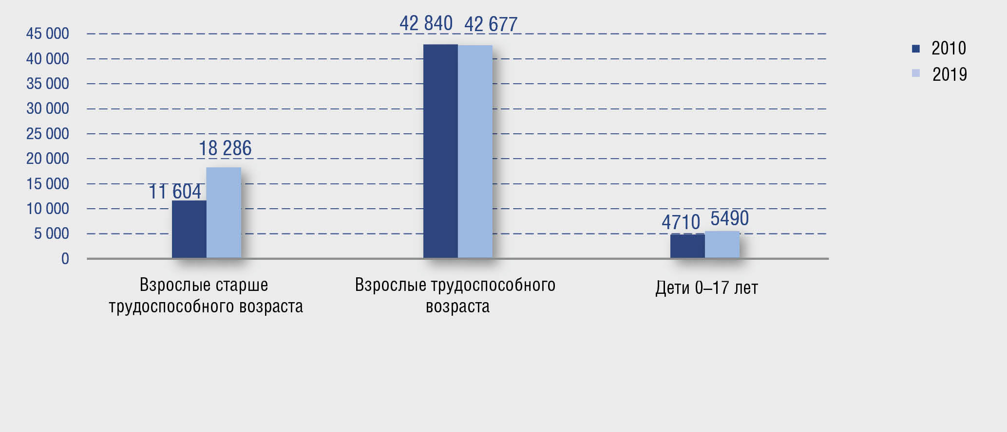 Увеличение числа пролеченных в круглосуточных стационарах пациентов с псориазом за указанный период практически полностью обусловлено увеличением числа пролеченных пациентов в возрасте старше трудоспособного — на 58%, с 11 604 в 2010 г. до 18 286 в 2019 г., в то время как число пролеченных пациентов с псориазом взрослого трудоспособного возраста оставалось приблизительно на одном уровне (42 840 в 2010 г. и 42 677 — в 2019 г.), а абсолютный прирост числа пролеченных детей в возрасте 0–17 лет (780) внес меньший вклад в прирост общего показателя (рис. 11).