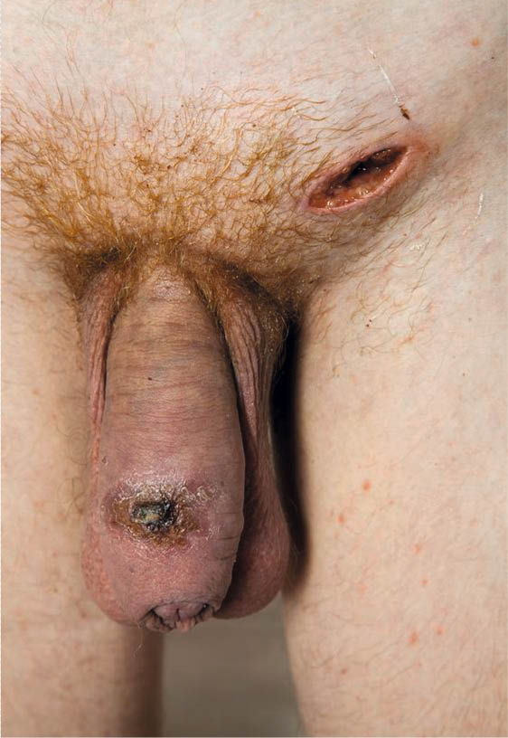 Рис. 1. Язвенный дефект на коже полового члена. Послеоперационная рана в области левой паховой складки