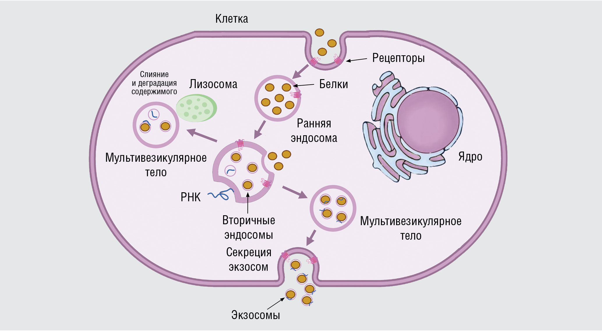 Далее первичная эндосома, созревая и окисляясь, превращается в мультивезикулярное тело [17], события в отношении которого могут далее развиваться по двум основным путям. Мультивезикулярное тело может соединиться в первом случае с клеточными лизосомами и подвергнуться деградации, а во втором — с клеточной мембраной с последующим высвобождением своего содержимого — экзосом во внеклеточное пространство путем экзоцитоза. Реализация того или иного пути в отношении мультивезикулярного тела будет зависеть от состава его мембраны. При наличии в ней белков с признаками убиквитин-опосредуемой деградации мультивезикулярное тело соединяется с лизосомой, а при содержании керамидов — с клеточной мембраной [18, 19].