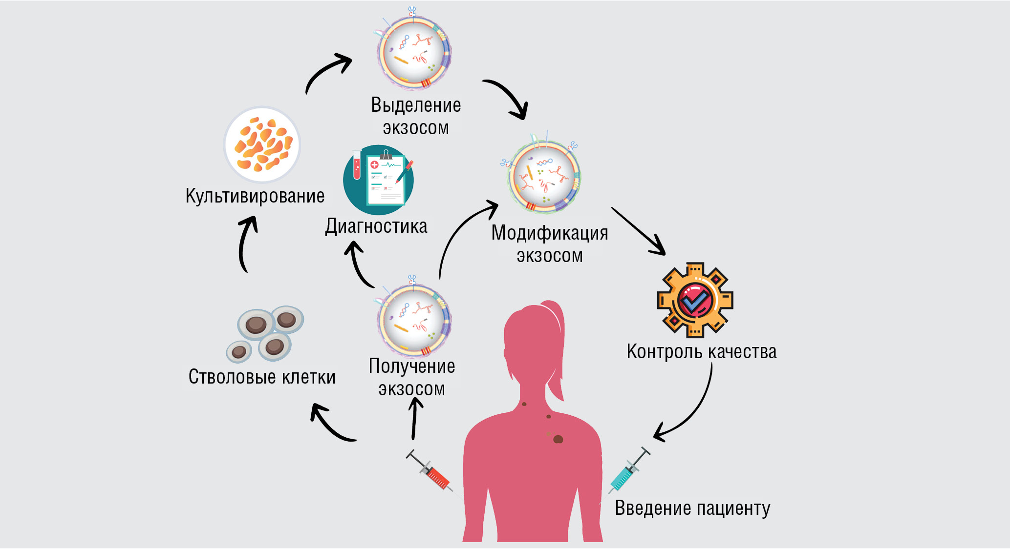 Модификация экзосом приобретает все большую значимость для разработки биофармацевтических препаратов. Тем не менее на сегодняшний день остается много открытых вопросов, связанных с возможностью применения экзосом в клинической практике. Основные проблемы касаются процесса получения необходимого количества таких везикул с возможностью масштабирования технологий, соответствующих стандартам производства лекарственных препаратов. Стандартизация идентификационных характеристик экзосом также выступает одной из существенных проблем, включающих гетерогенность, состав, функции, вводимое количество (дозировку), продолжительность воздействия, а также способы введения экзосом пациенту [31].