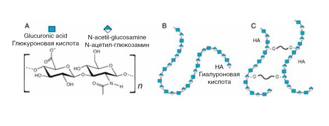 Рис. 1. Молекулярные структуры (A) дисахаридной субъединицы ГК, (B) нативной полисахаридной цепи ГК и (C) поперечно-сшитой ГК, используемой для тканевой имплантации [4] / Fig. 1. Molecular structures of HA disaccharide subunit (A), native HA polysaccharide chain (B) and cross-linked HA (C) used for tissue implantation [4]