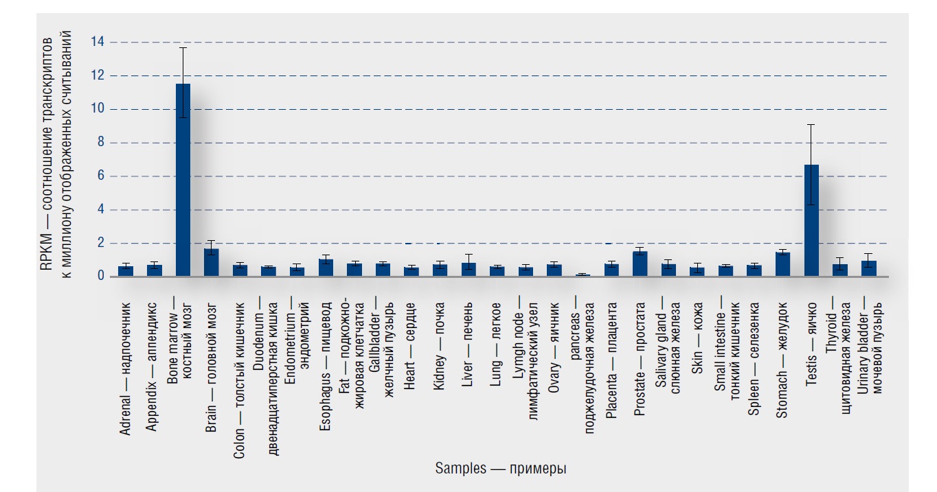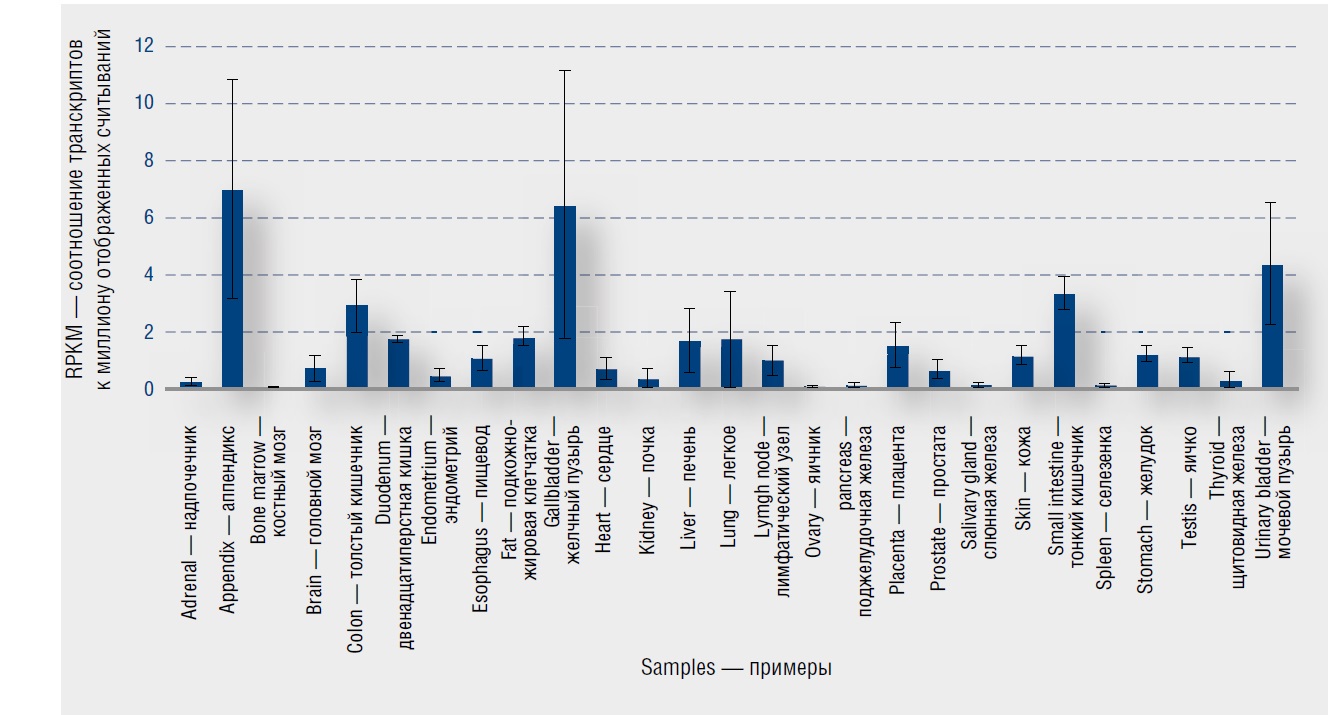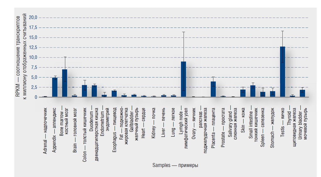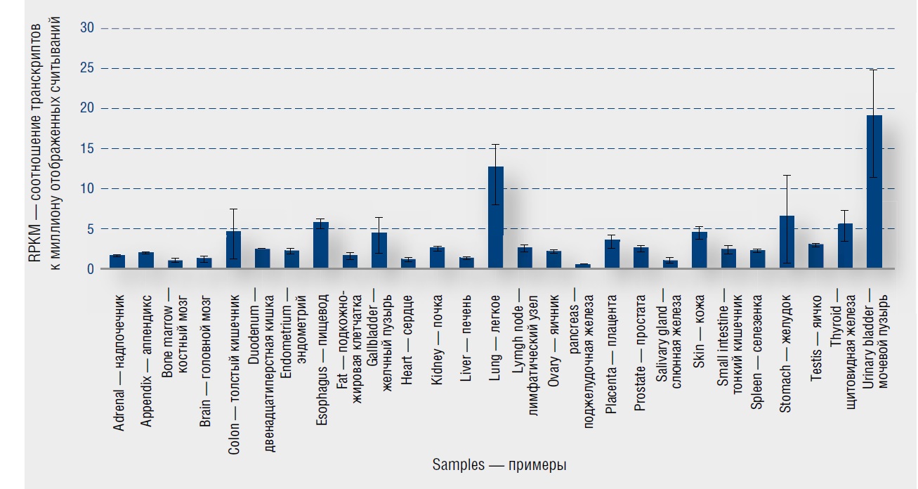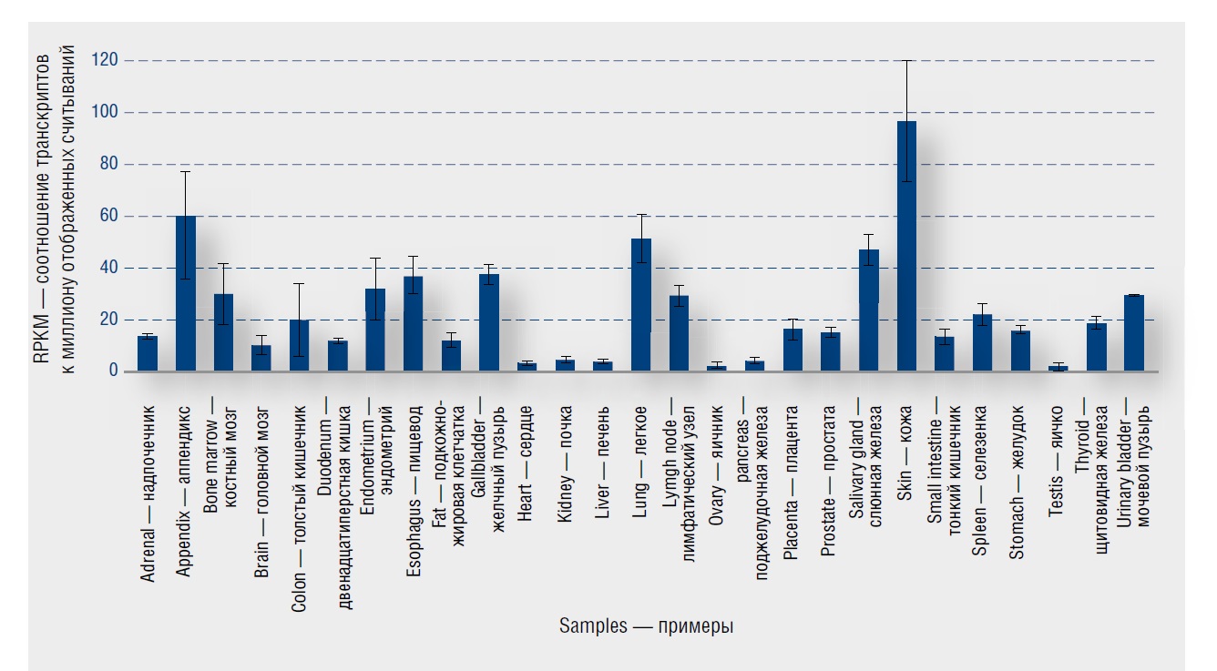 Рис. 7. Экспрессия HYAL3 в коже и других тканях человека [19] / Fig. 7. Expression of HYAL3 in skin and other human tissues [19]