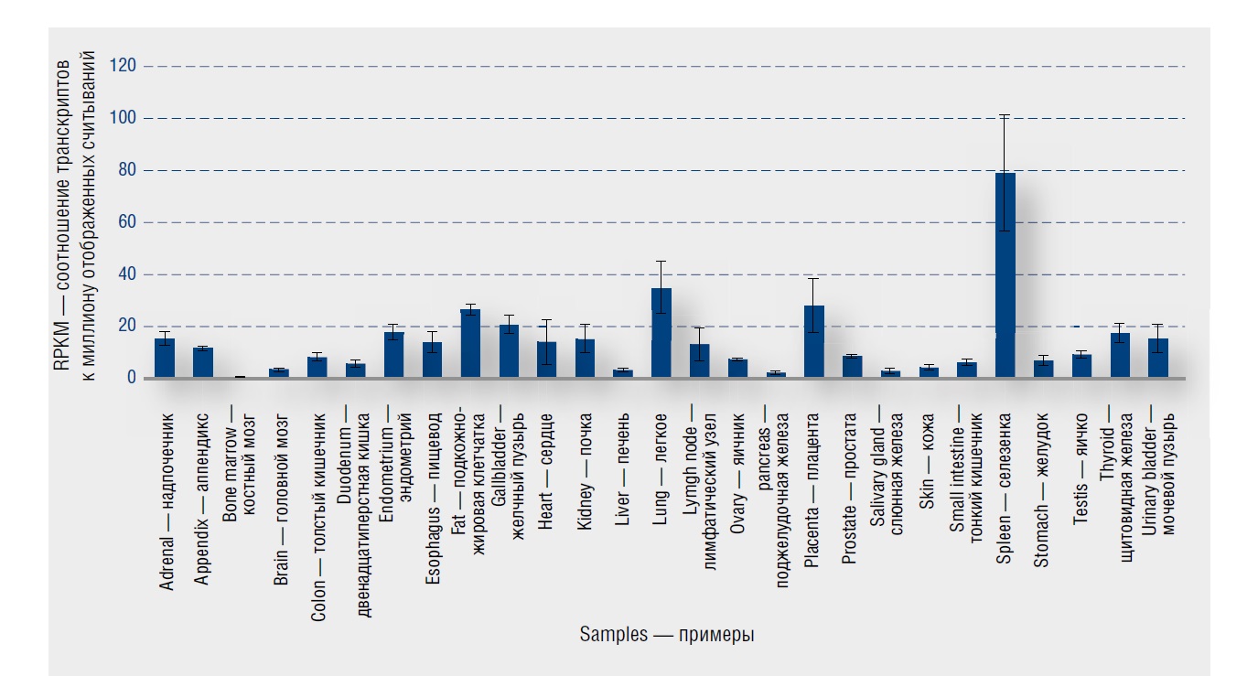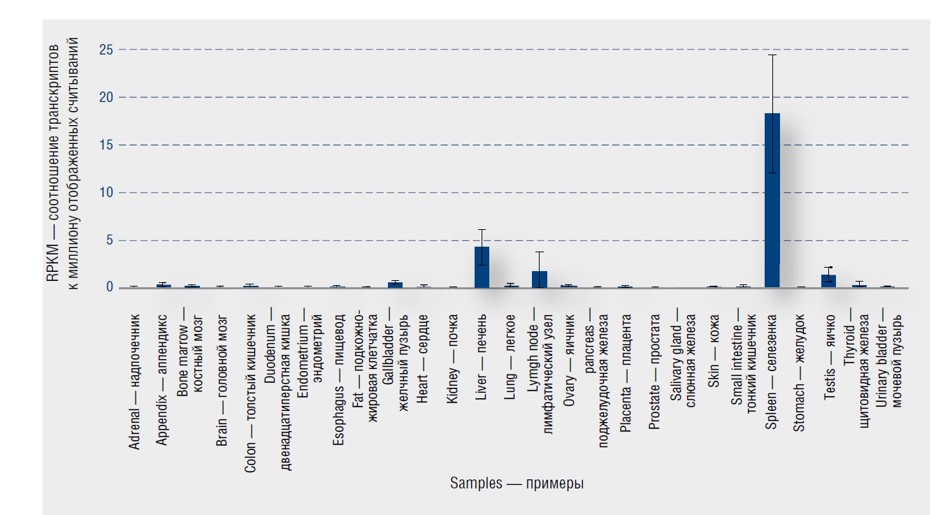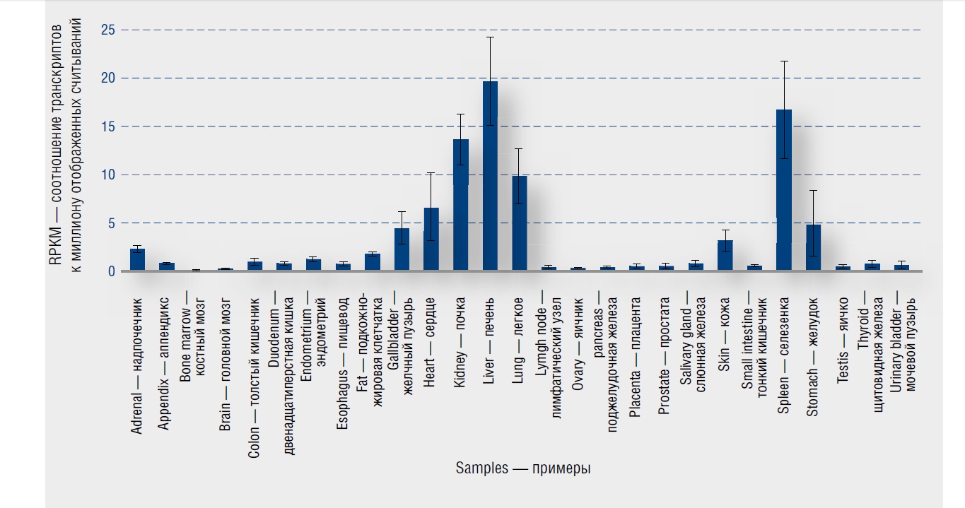 Ген HYAL1 локализован на хромосоме 3p21.31, экзон 6 [17]. Этот ген кодирует лизосомальную гиалуронидазу 1 типа, которая внутриклеточно разрушает ГК. Этот фермент активен при кислом pH и является основной гиалуронидазой в плазме. Мутации в этом гене связаны с мукополисахаридозом типа IX или дефицитом гиалуронидазы. Ген является одним из нескольких родственных генов в области хромосомы 3p21.3, связанных с подавлением опухоли. Для гена HYAL1 обнаружено несколько вариантов транскрипта, кодирующих разные изоформы. РНК-секвенирование, выполненное в образцах тканей 95 клинически здоровых людей, представляющих 27 различных тканей, с целью определения тканеспецифичности всех генов, кодирующих гиалуронидазу 1 типа, продемонстрировали, что ген HYAL1 преимущественно экспрессируется в печени (RPKM 19,6), селезенке (RPKM 16,7) и 10 других тканях (табл. 4). Экспрессия HYAL1 в коже средняя (RPKM 3,19 ± 1,105).