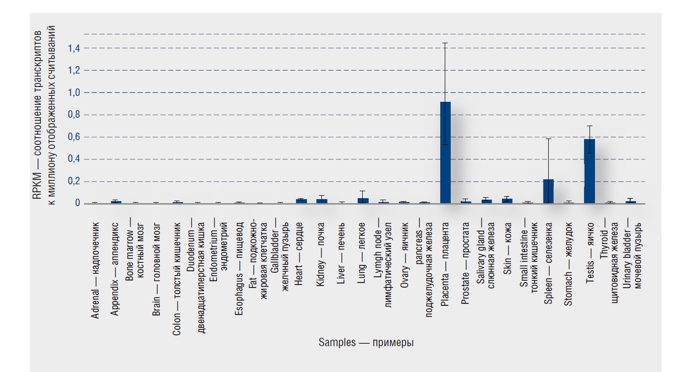 Ген HYAL4, кодирующий фермент гиалуронидазу 4 типа, локализован на хромосоме 7q31.32, экзон 10 [20]. Этот ген кодирует белок, сходный по структуре с гиалуронидазой, но лишенный гиалуронидазной активности. Гиалуронидаза 4 типа действует как хондроитин-сульфат-специфическая эндо-бета-N-ацетилгалактозаминидаза, то есть она проявляет гидролитическую активность в отношении цепей хондроитинсульфата и разлагает их на олигосахариды. Протеогликаны образуются за счет ковалентного связывания цепей хондроитинсульфата с белком. Протеогликаны являются повсеместными компонентами внеклеточного матрикса соединительных тканей, а также обнаруживаются на поверхности многих типов клеток, где они участвуют во множестве клеточных процессов, таких как пролиферация, дифференцировка, миграция, распознавание клеток, отложение внеклеточного матрикса и морфогенез тканей. Экспрессия этого гена наиболее высока в плаценте (RPKM 0,99) и семенниках (RPKM 0,58) (табл. 7). В коже средняя экспрессия HYAL4 низкая (RPKM 0,045 ± 0,019).