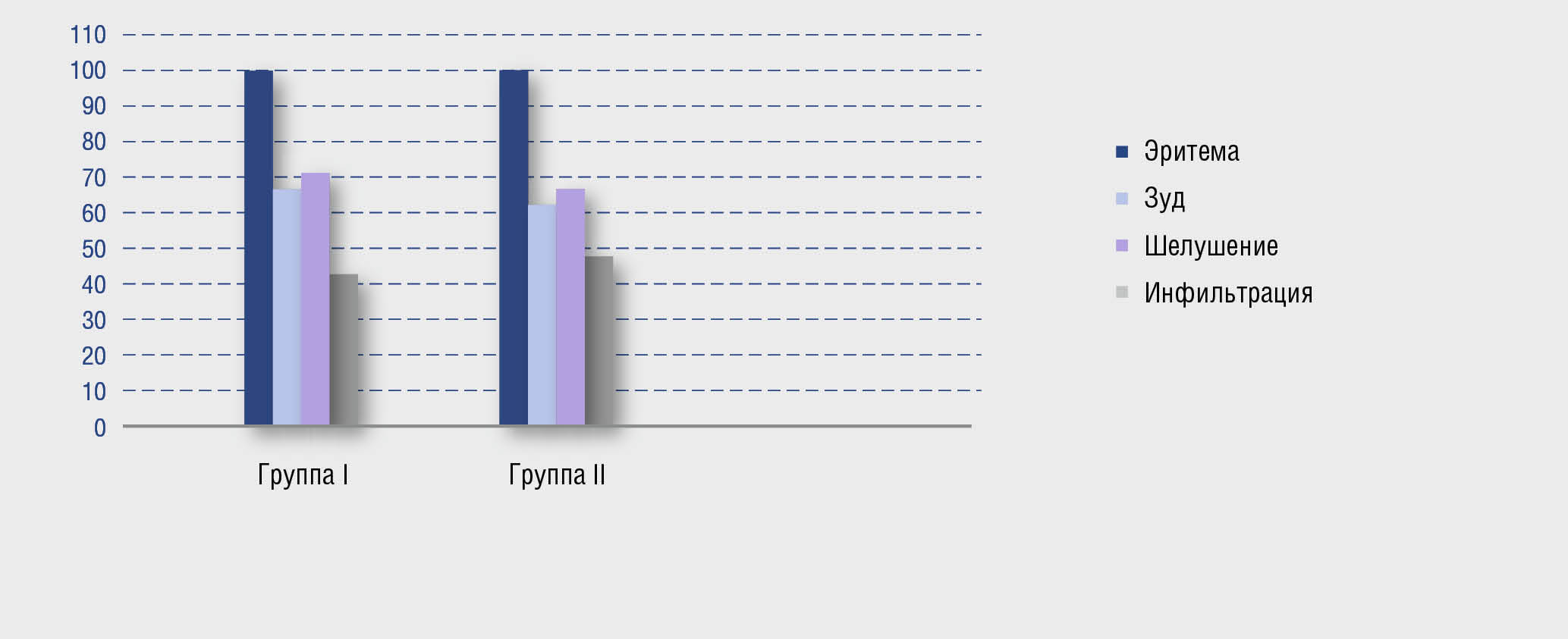 Основными субъективными симптомами себорейного дерматита с локализацией на лице с переходом на волосистую часть головы у пациентов 1-й группы являлись: эритема — у 21 (100%) пациента, зуд — у 14 (66,6%), шелушение — у 15 (71,4%), инфильтрация — у 9 (42,8%). Во 2-й группе предъявляли жалобы на зуд — 13 (61,9%) пациентов, на шелушение — 14 (66,6%), инфильтрация наблюдалась у 10 (47,6%) пациентов, эритема — у 21 (100%) пациента. Степень выраженности клинических проявлений у пациентов обеих групп до начала терапии достоверно не различалась, в основном наблюдалась максимальная и средняя выраженность симптомов.