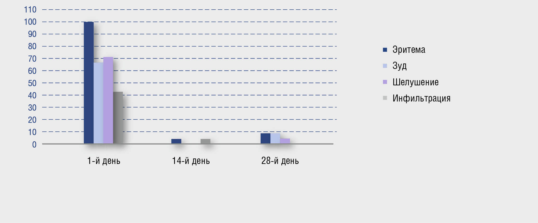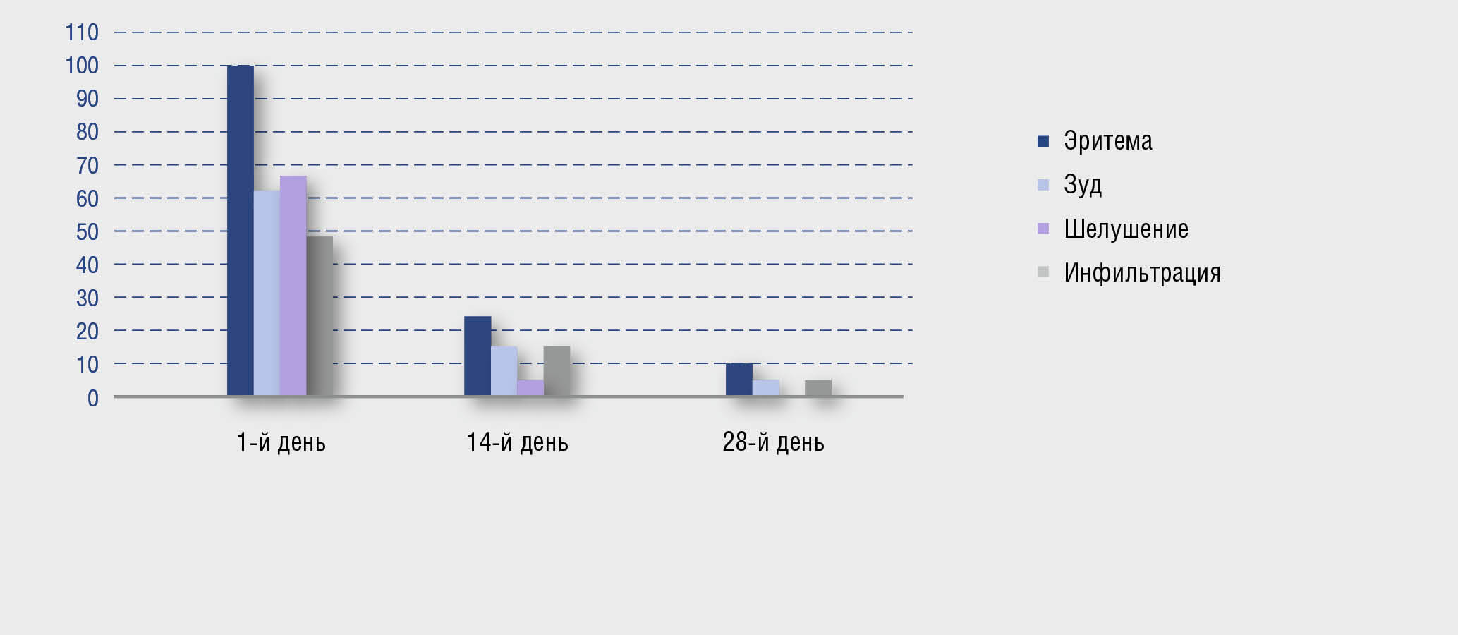 По данным наблюдения, на 28-й день у пациентов 1-й группы после краткосрочного применения топического глюкокортикостероида мометазона фуроата 0,1%, крема показатели клинических проявлений достоверно не изменились, эффективность терапии составила 90,5% (19) пациентов, у 2 пациентов отмечено возобновление клинических проявлений в виде эритемы (2 балла), зуда (1 балл) и шелушения (2 балла).