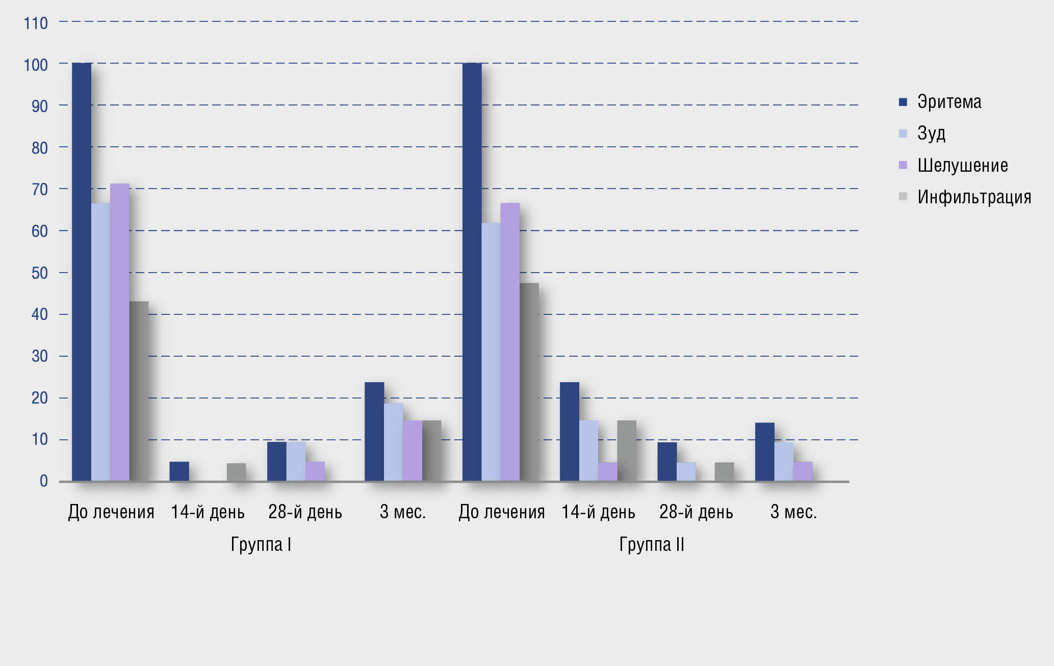 Контроль эффективности наружной терапии осуществлялся на 14-й и 28-й день после начала лечения в соответствии с критериями (отсутствие и уменьшение клинических проявлений). Окончательный результат оценивался через 3 месяца от начала терапии. В ходе наблюдения пациентам проводилось обследование, включавшее осмотр кожных покровов и определение признаков (симптомов) по совокупности показателей, фиксирование любых нежелательных явлений с момента последнего визита.