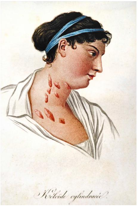 Келоиды были описаны египетскими хирургами около 1700 г. до н.э. Барон Жан-Луи Алибер (J. L. Alibert; 1768–1837) в 1806 г. дал определение cancroïde; позже изменил на chéloïde; чтобы избежать путаницы с раком. Слово происходит от греческого ÷çëή (челе); что означает «копыто»; «крабовые клешни»; и суффикса -oid; то есть «как» (рис. 1; 2).