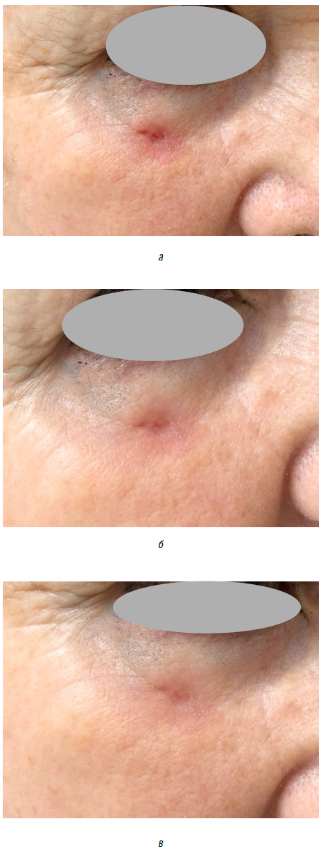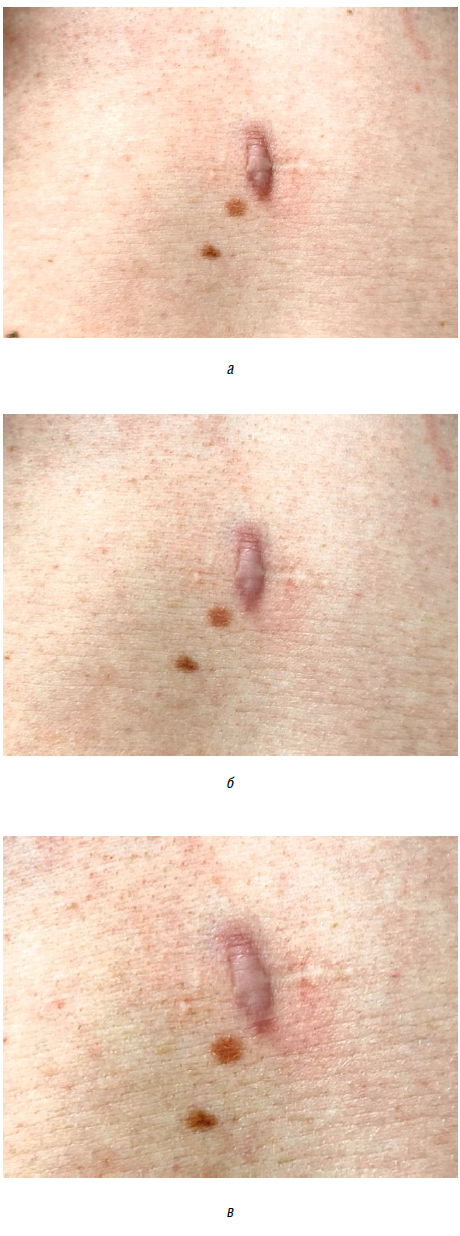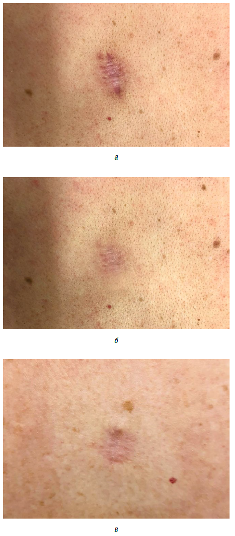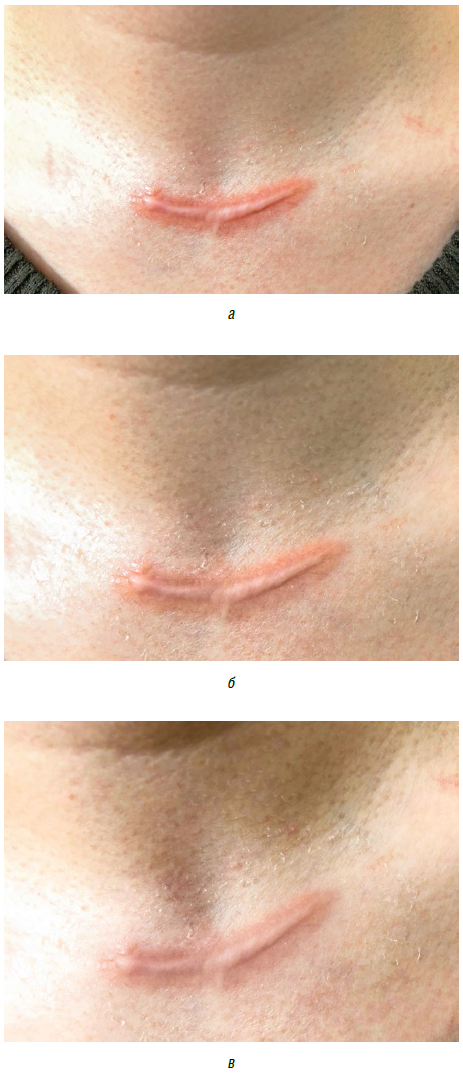 Рис. 4. Рубец: а — до лечения; б — через 2 нед. после лечения; в — через 1 мес. после лечения