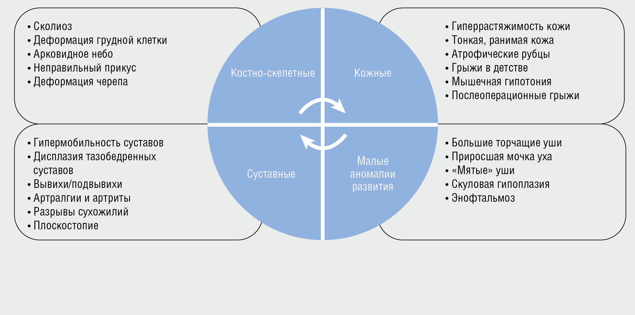 Термин «дисплазия» происходит от древнегреческого: δυσ- — приставка, отрицающая положительный смысл слова, и πλάσις — образование, формирование. К дисплазиям соединительной ткани относятся патологии волокон и основного вещества соединительной ткани, имеющие генетическую обусловленность. Морфологические изменения могут быть разнообразными: нарушение формирования спиралей коллагена, эластических волокон, гликопротеинов и протеогликанов, а также изменения и нарушения функционирования фибробластов [6, 7]. При этом отдельно в группу мукополисахаридозов относят нарушение обмена кислых гликозаминогликанов, а при дисплазии соединительной ткани — основная группа пациентов с патологией обмена коллагена (коллагенопатии). Заболевание может протекать с разнообразием клинических проявлений, объединенных в фенотипы по внешним и/или висцеральным синдромам. Синдромы могут протекать изолированно, доброкачественно, а могут вовлекаться в симптомокомплекс других дисплазий соединительной ткани [8].