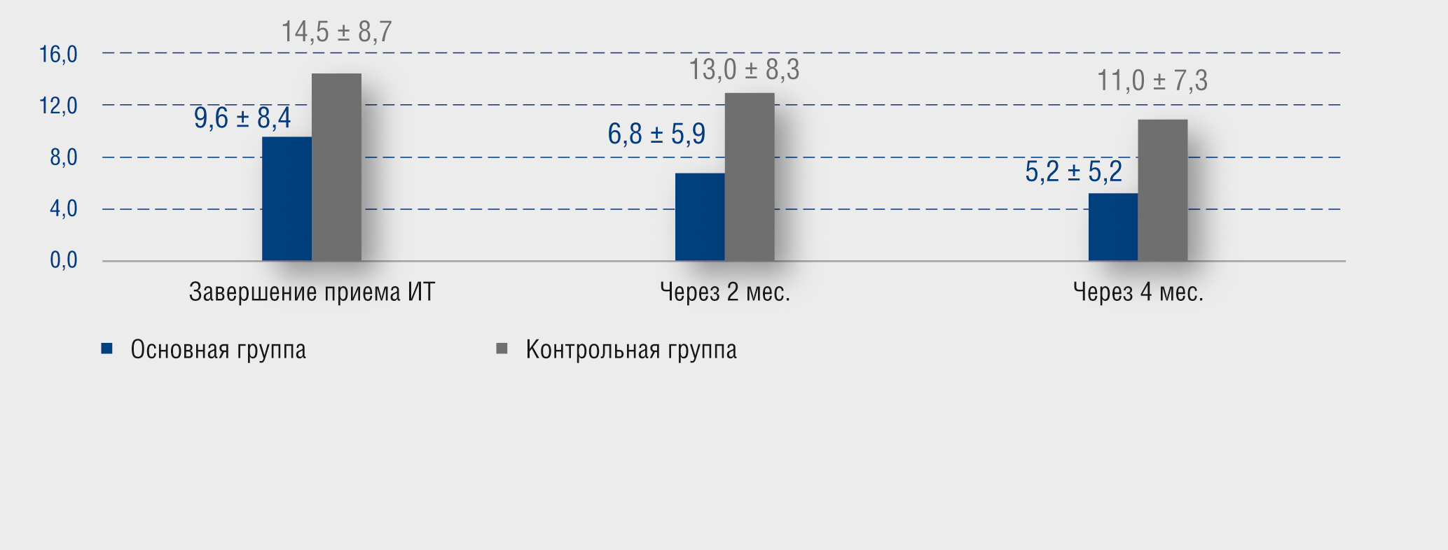 Средние значения суммарного индекса выраженности рубцов по Международной количественной классификации постакне (G. Goodman и соавт.) после завершения приема изотретиноина в основной группе составили 9,6 ± 8,4 балла, что было меньше на 33,8%, чем в контрольной. К концу наблюдения в обеих группах отмечено снижение уровня индекса, однако более выраженный регресс также был зарегистрирован у пациентов основной группы. Уже на 2-м месяце поддерживающей терапии в этой группе данный показатель был существенно ниже, чем до начала терапии (p < 0,05) и отличался от группы контроля на 47,7%. К 4-му месяцу данная тенденция сохранилась и значения индекса в основной группе были меньше на 52,7%, чем в контрольной (рис. 2).