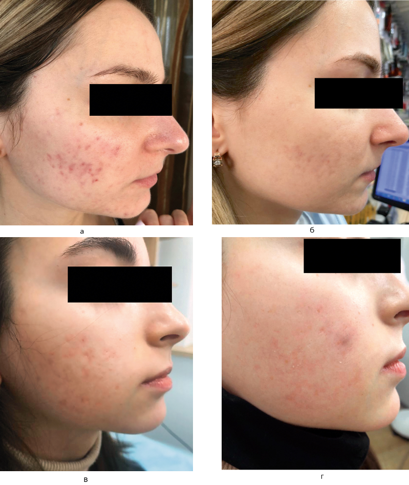 Background. Acne has a net detrimental effect on the quality of life of patients, which is due not only to long-term treatment and predominance of dermatosis on the face, but also due to substantial risk of development of enduring post-inflammatory skin changes. The main part of treatment methods for post-acne marks is currently aimed at correction of already formed rash, and not at prevention of its development. In this respect, studies aimed at development of new methods for prevention and treatment of post-inflammatory skin changes in acne are particularly topical.