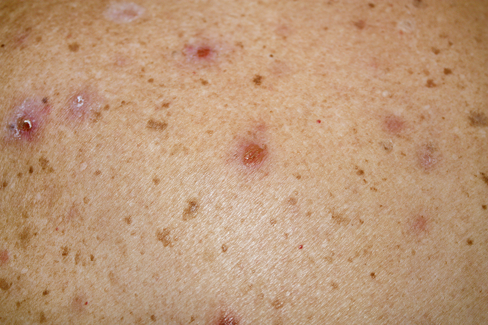1) в области туловища, верхних и проксимальных отделов нижних конечностей — изолированные вялые пузыри диаметром 0,5–0,7 см, располагавшиеся как на неизмененной коже, так и на фоне незначительной эритемы округлой формы (до 1,5–2 см в диаметре); содержимое пузырей прозрачное, большая часть пузырей вскрылась с образованием эпителизирующихся эрозий; общее количество пузырей не превышает 60 шт.; симптом Никольского — отрицательный; субъективно — контактная болезненность;