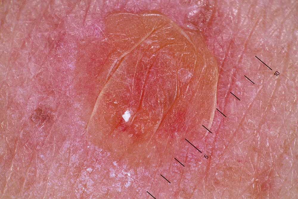 Рис. 3. Пациент Р. Кожа спины. Дерматоскопия: изолированный пузырек диаметром 0,7 см с вялой покрышкой