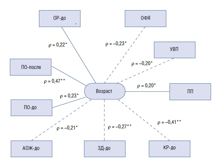 Fig. 1. The relationship between age and psychological characteristics of women with facial skin defects. Note: * — p < 0.05; ** — p < 0.01; ОФЯ — Attitude to your physical “Ego”; УВП — Confidence in your visual appeal; ПП — Positive overvaluation; КР-до — Beauty (before treatment); ЗД-до — Health (before treatment); АОЖ-до — Active attitude to life situation (before treatment); ПО-до — Positive self-image (before treatment; ПО-после — Positive self-image after treatment; ОР-до — Self-rating, real “Ego” (before treatment).