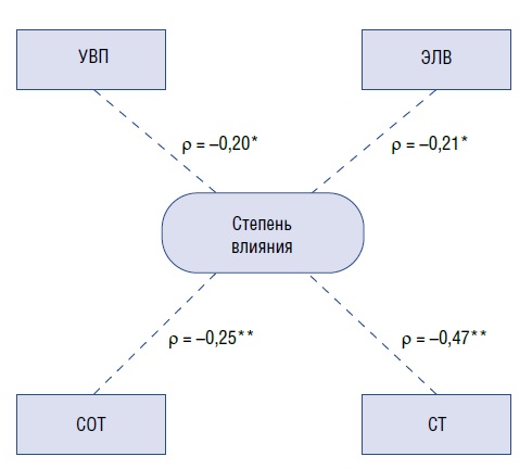 Fig. 2. The relationship between the degree of influence of a cosmetic problem on vital functions and the psychological characteristics of women with facial skin defects. Note: * — p < 0.05; ** — p < 0.01; ЭЛВ — Effectiveness of treatment (cosmetologist’s assessment); УВП — Confidence in your visual appeal; СТ-после — Tranquility-anxiety (after treatment); СОТ — Collaboration.