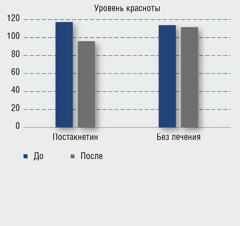 Рис. 1. Динамика выраженности красноты: до и через 28 дней использования геля Постакнетин; без лечения