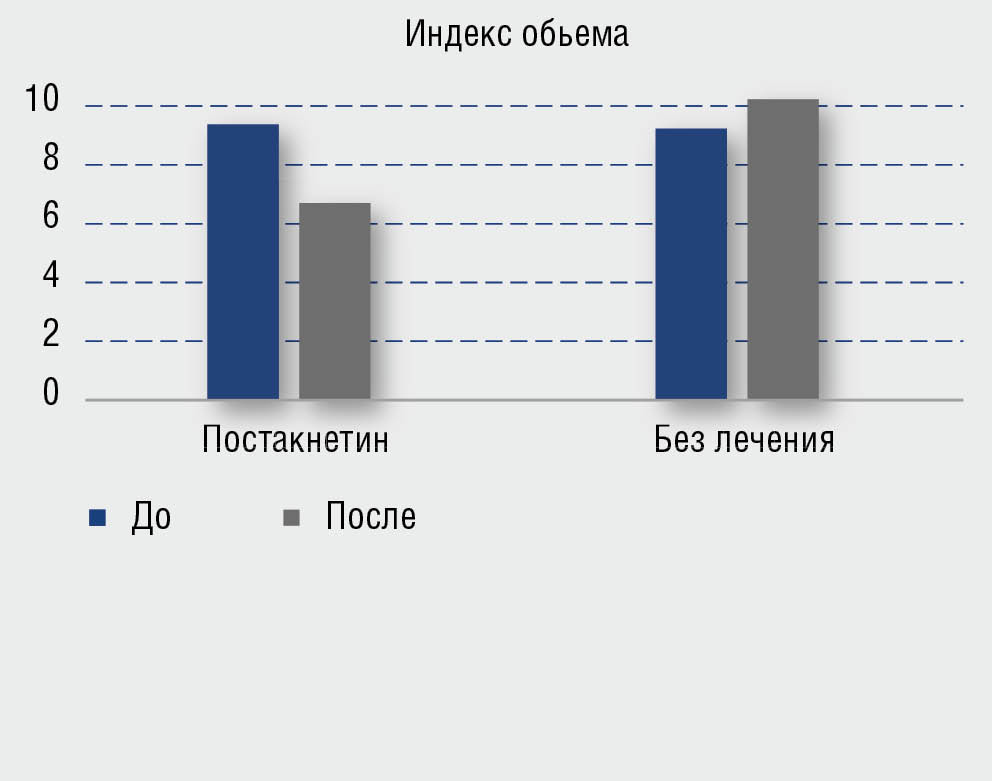 Рис. 3. Динамика индекса объема: до и через 28 дней использования геля Постакнетин; без лечения