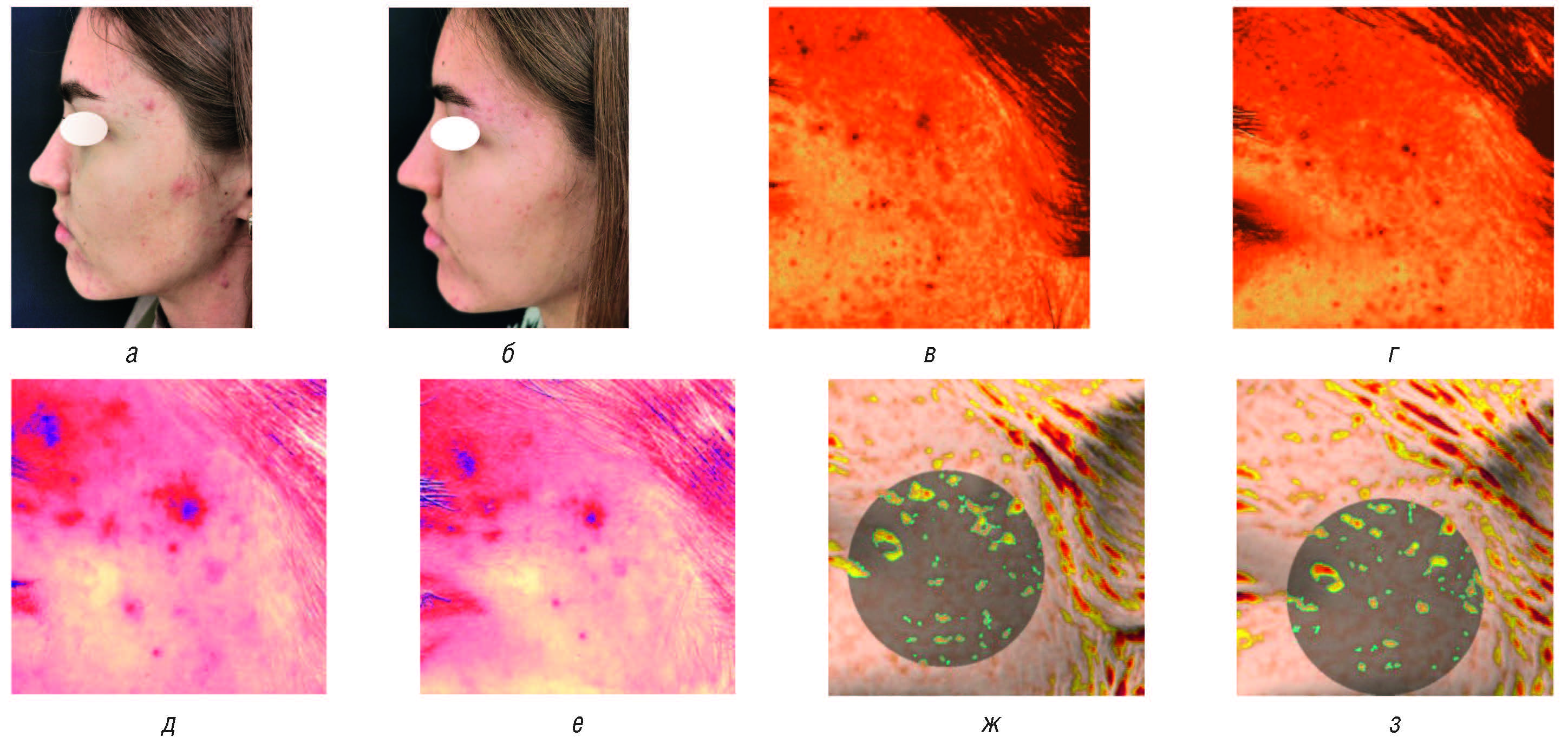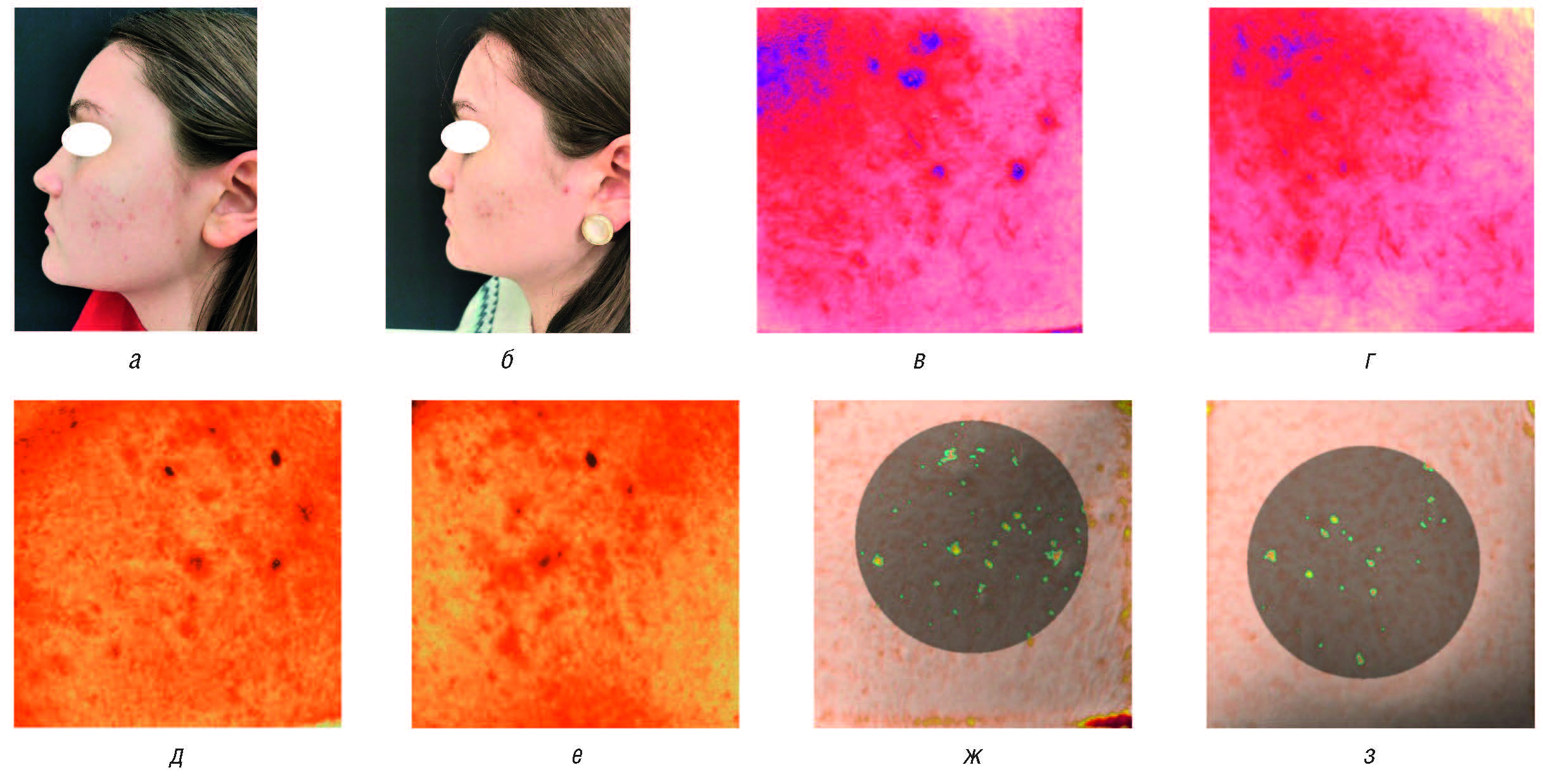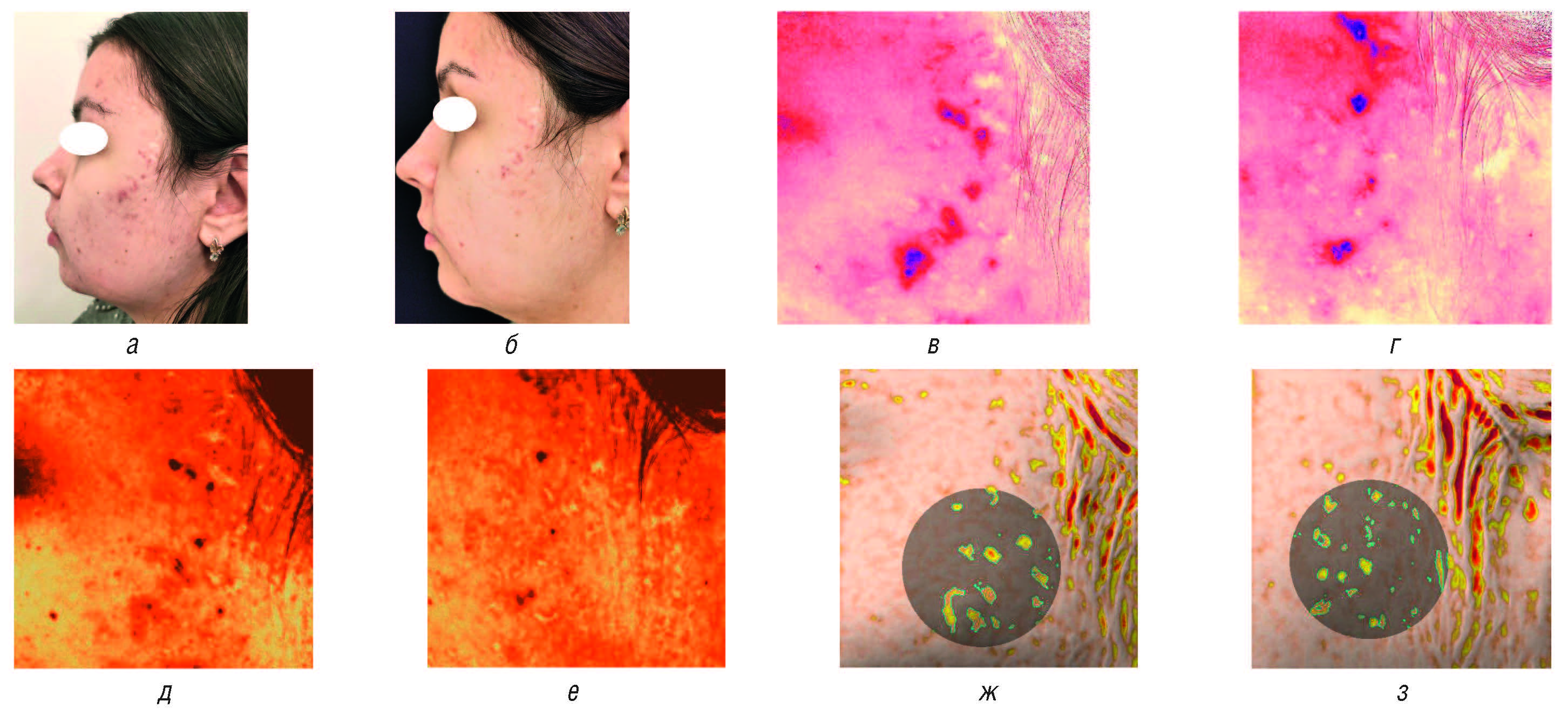 Рис. 5. Пациентка 21 года с наличием симптомокомплекса постакне: а — до лечения; б — через 28 дней использования геля Постакнетин; в — уровень пигментации до лечения; г — уровень пигментации после лечения; д — уровень красноты до лечения; е — уровень красноты после лечения; ж — индекс объема до лечения; з — индекс объема после лечения