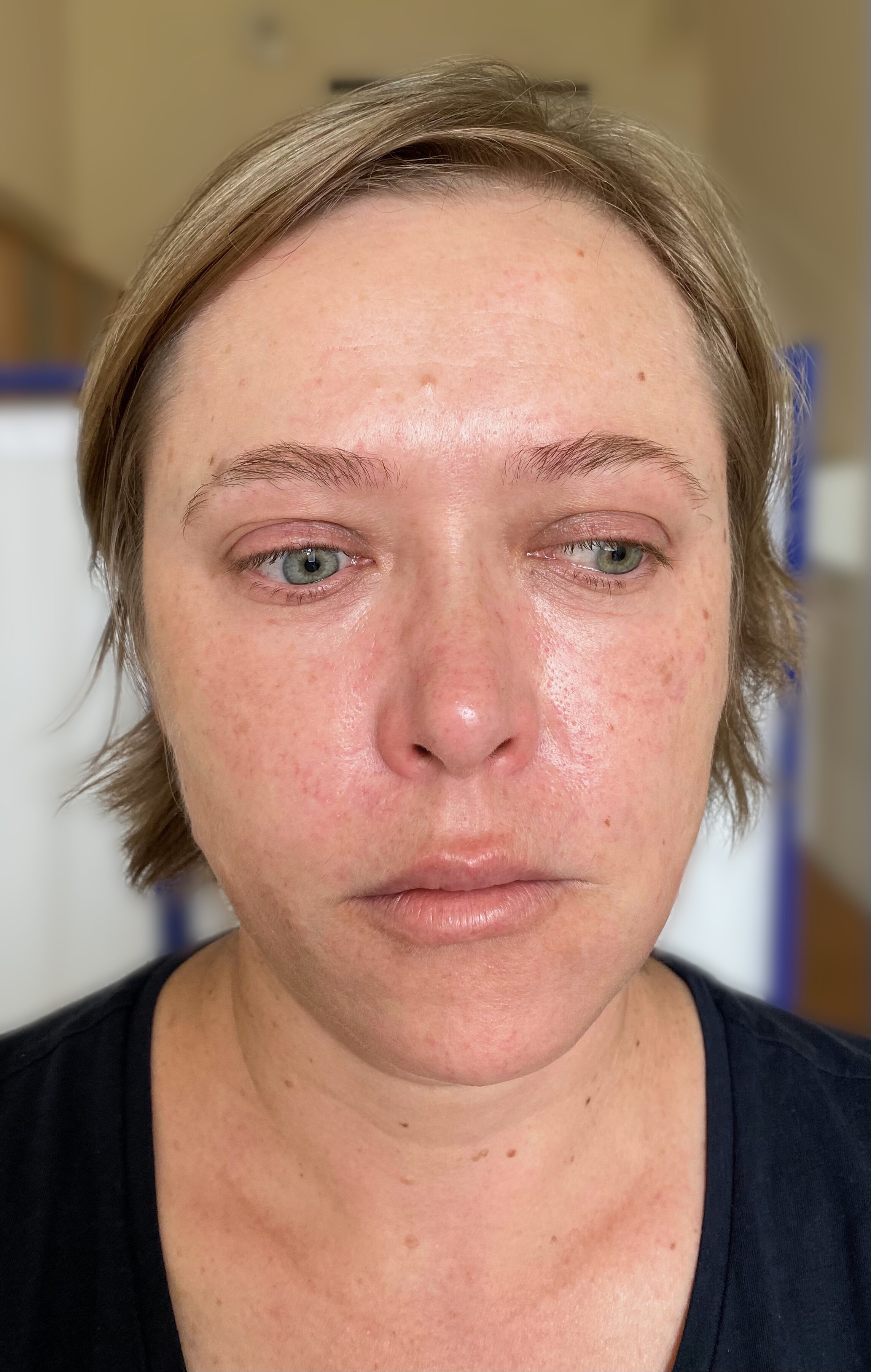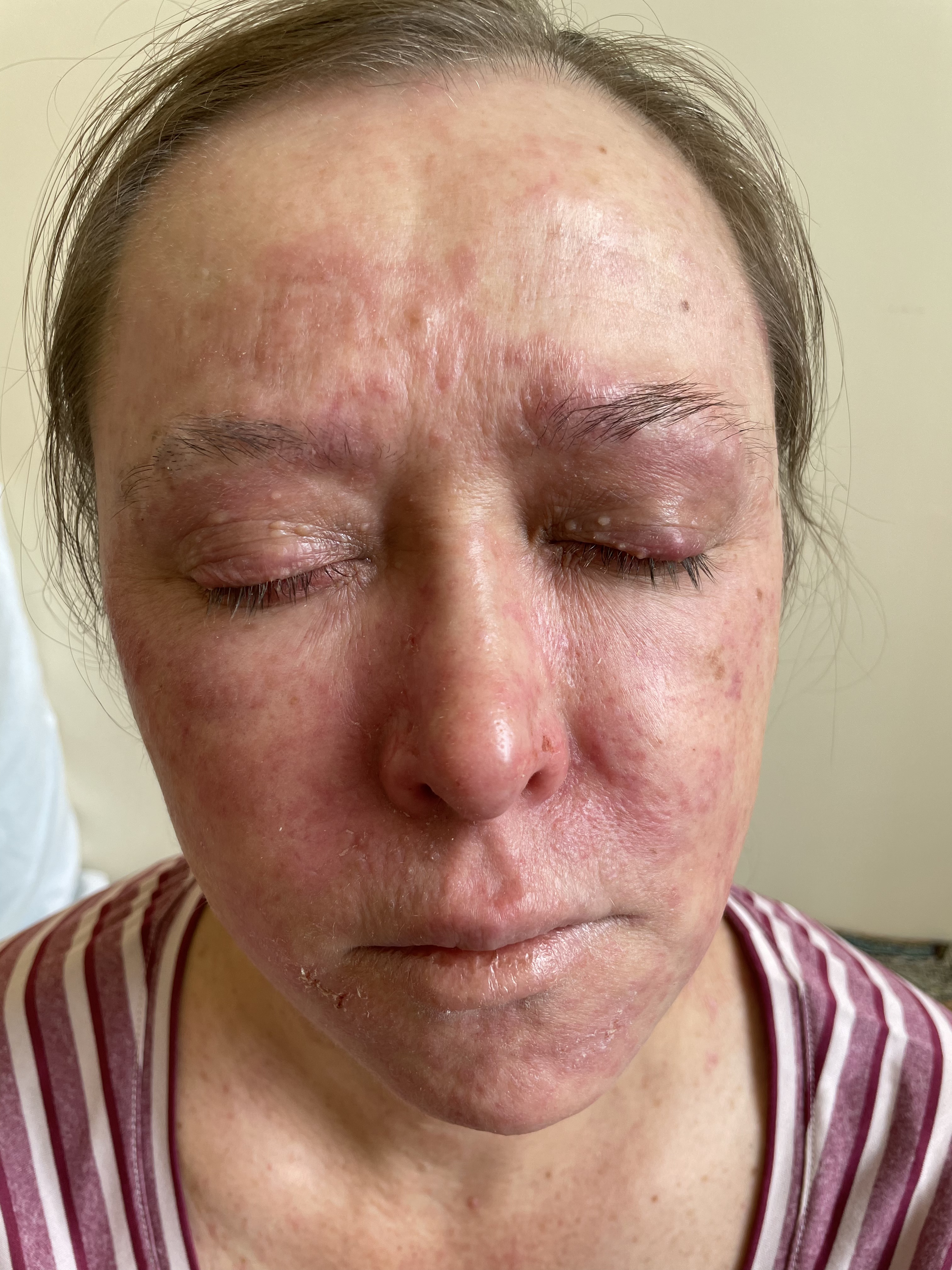 Таким образом, в течение 1,5 года у больной последовательно диагностировали «периоральный дерматит», «дерматомиозит?» без миозита, «розацеа (папуло-пустулезный подтип, офтальморозацеа)». В связи с этим получала циклами 0,1% мазь такролимуса, тетрациклиновую мазь, доксициклин и метронидазол перорально. Во время лечения отмечала незначительную и временную положительную динамику, но заболевание продолжало рецидивировать и распространилось на кожу шеи и верхней трети груди.