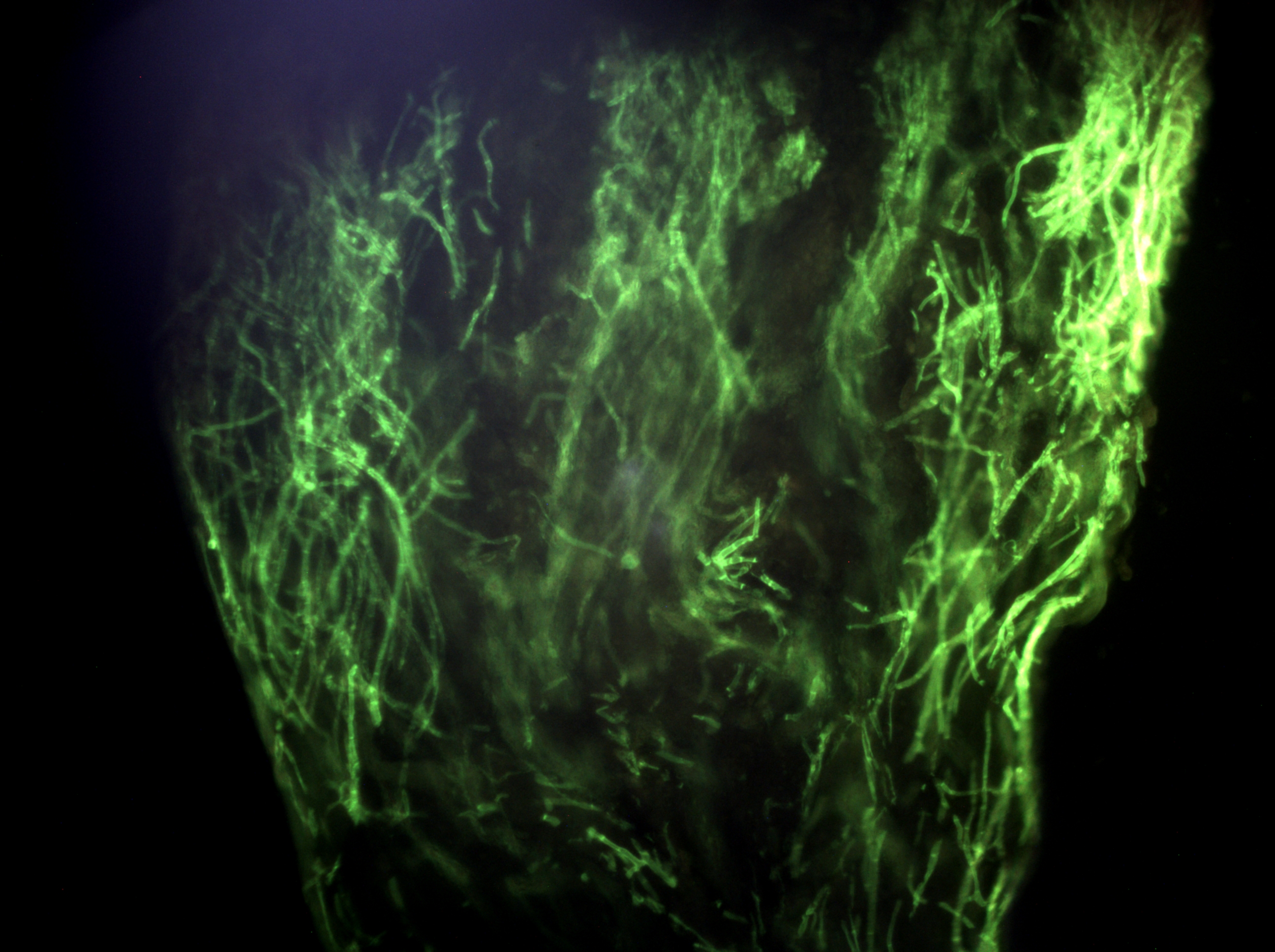 Рис.4. Люминесцентная микроскопия с использованием калькофлюора белого вместе с 30% раствором КОН: зелёная флюоресценция нитей септированного мицелия и спор гриба, расположенных в волосе – поражение волоса по типу «trichophyton endothrix» (х 200).