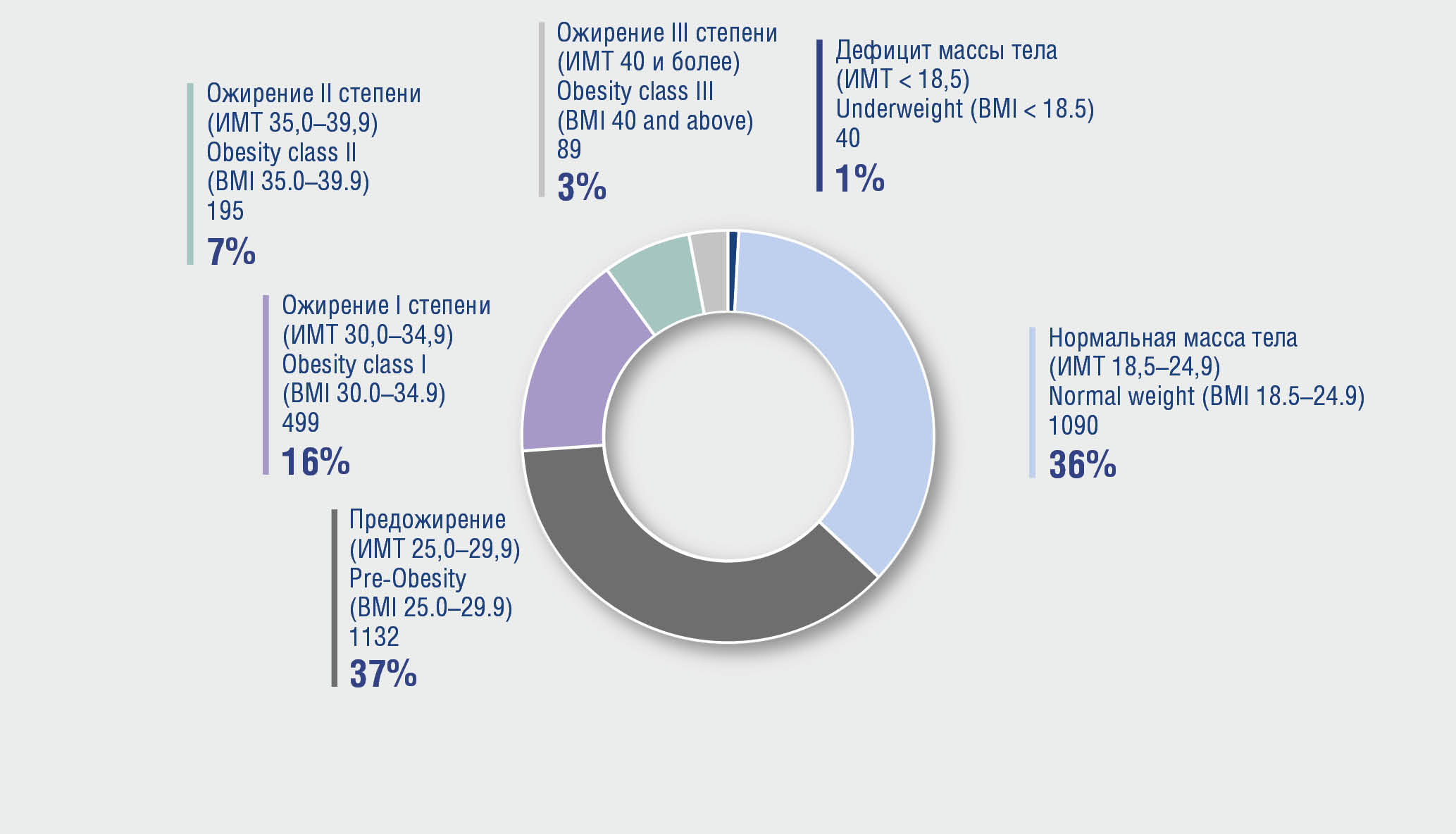 Рис. 2. Распределение пациентов с псориазом по индексу массы тела в соответствии с классификацией ВОЗ (n = 3045)