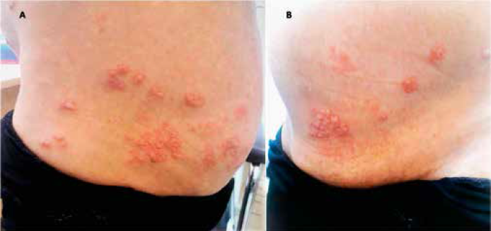 Fig. 2. (A, B): Grouped vesicles on an erythematous base on the lower abdomen