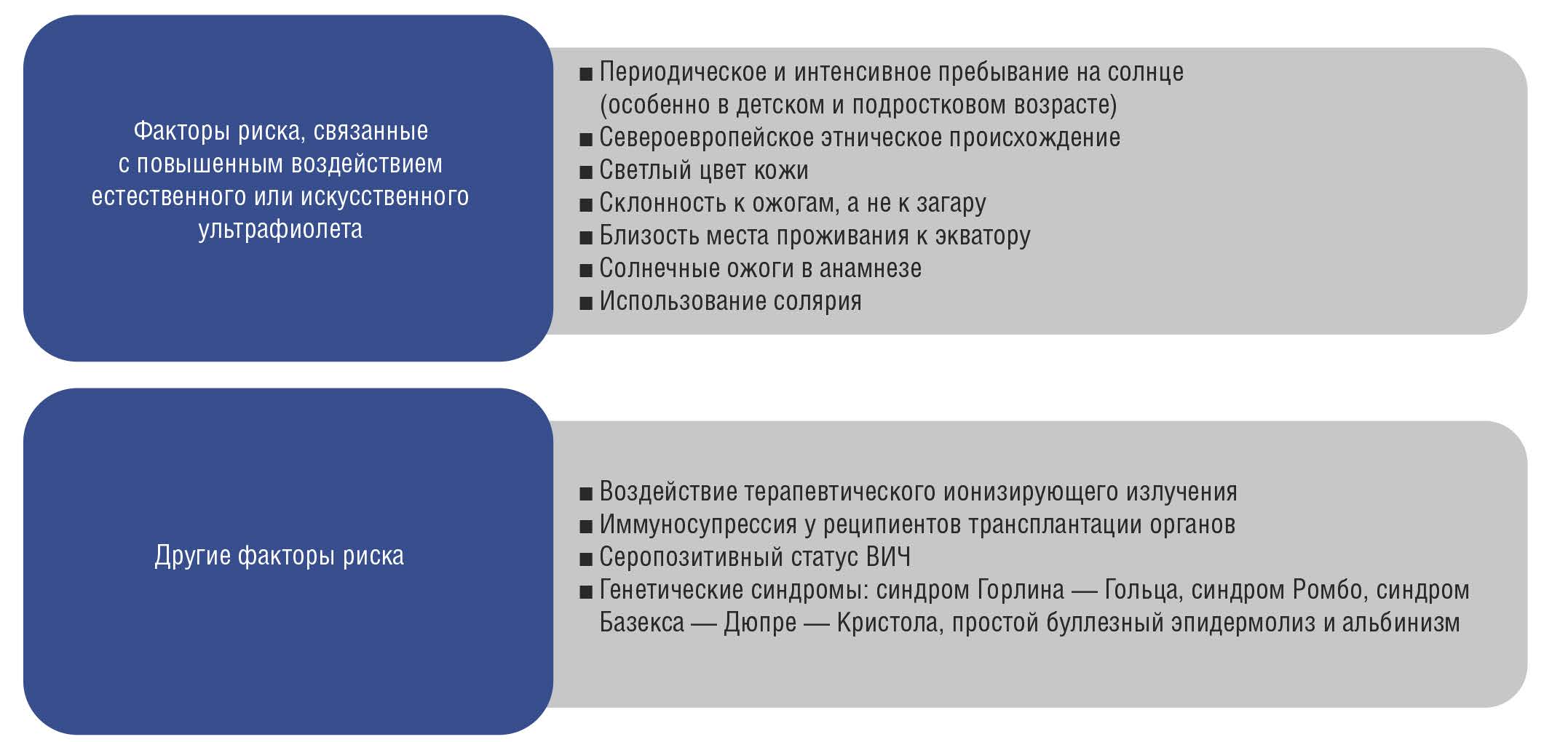 Факторы риска развития базальноклеточного рака кожи включают в себя пожилой возраст, воздействие ультрафиолетового излучения (включая профессиональное воздействие и воздействие в свободное время), фототип кожи, пол, фармакологическую терапию сопутствующей патологии, лучевую терапию в анамнезе, семейный анамнез кожных опухолей, длительное воздействие мышьяка, иммуносупрессию и некоторые генетические синдромы [3–5].