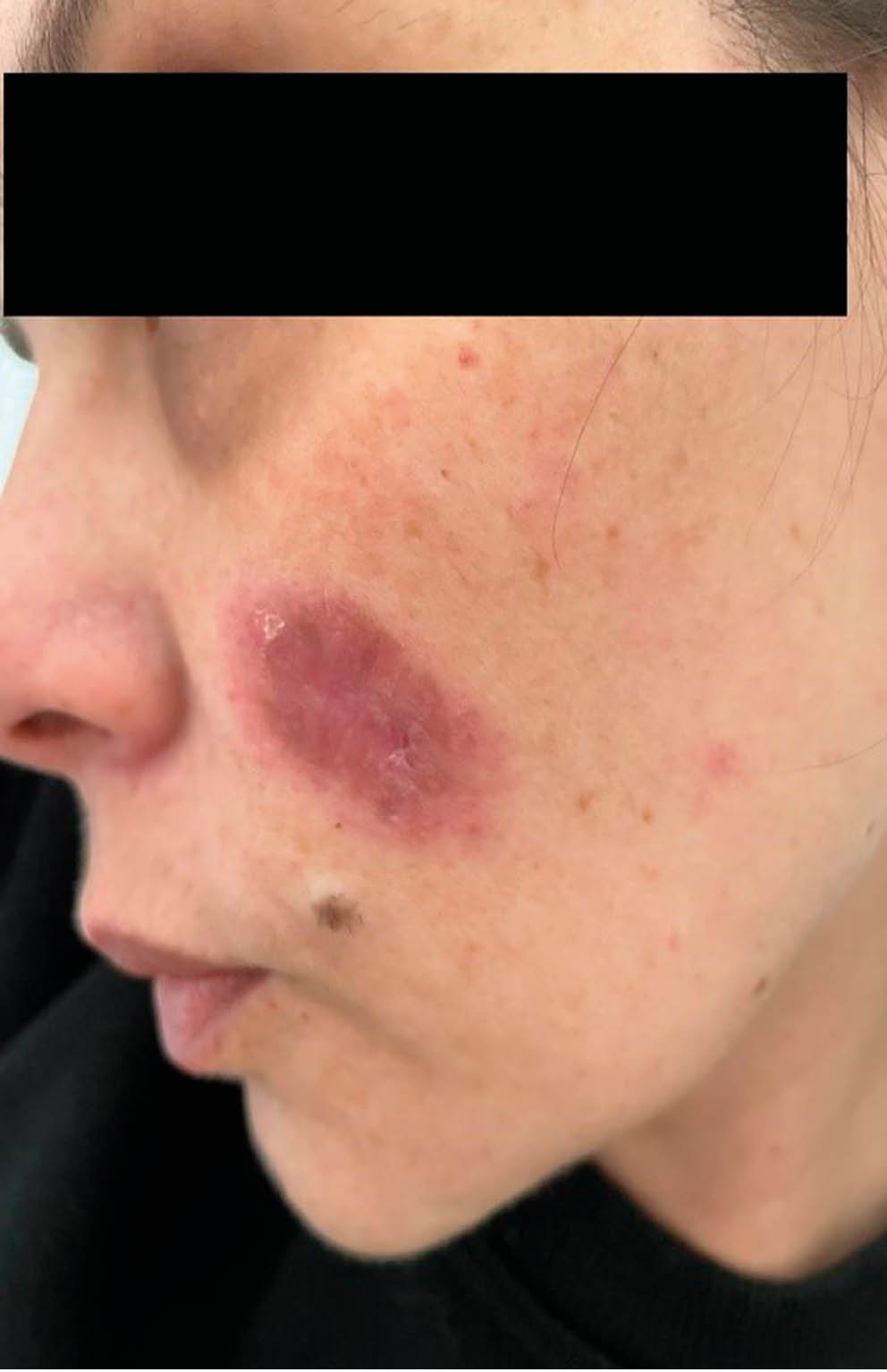 Fig. 1. Patient K. Moderately infiltrated red plaque with clear boundaries, slight atrophy in the center and slight superficial scaling on the skin of the left cheek