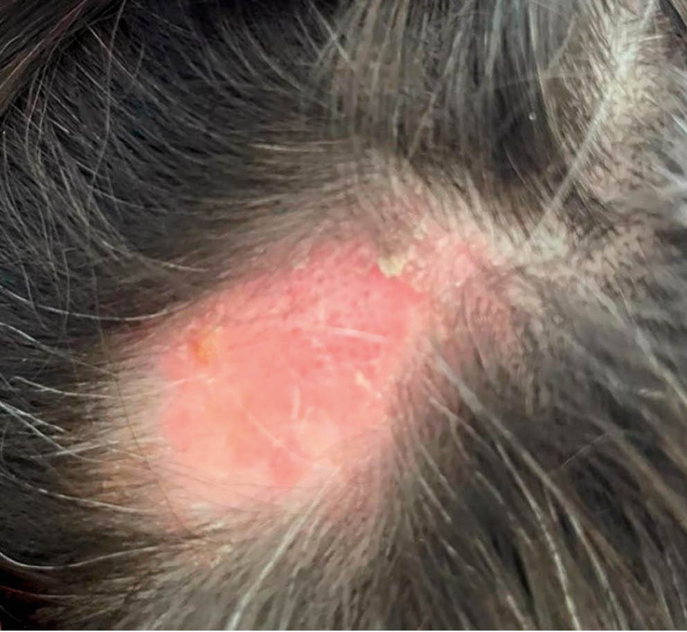 Widespread skin lesions are observed. Lesions are found on the breast, back, and shoulder skin and presented by multiple irregularly shaped pink-red papules and plaques with mild infiltration, mild desquamation, and clear boundaries (fig. 7). A cicatricial alopecic lesion of pink color with relatively clear boundaries, superficial desquamation, and mild skin atrophy is found on the scalp skin. The lesion diameter is about 3 cm (fig. 8). Examination of the mucous membrane of the oral cavity along the dental line revealed whitish papules forming a "fern leaf" pattern.