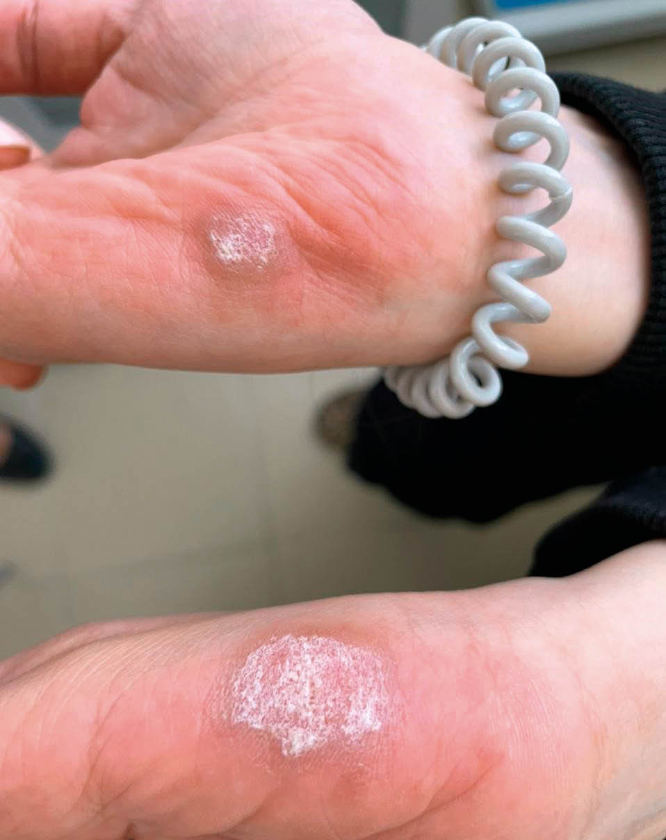 Fig. 3. Patient K. Plaques on the skin of the lateral surface of the hands: on examination, pronounced hyperkeratosis is revealed, the boundaries are clear, on palpation — moderate infiltration